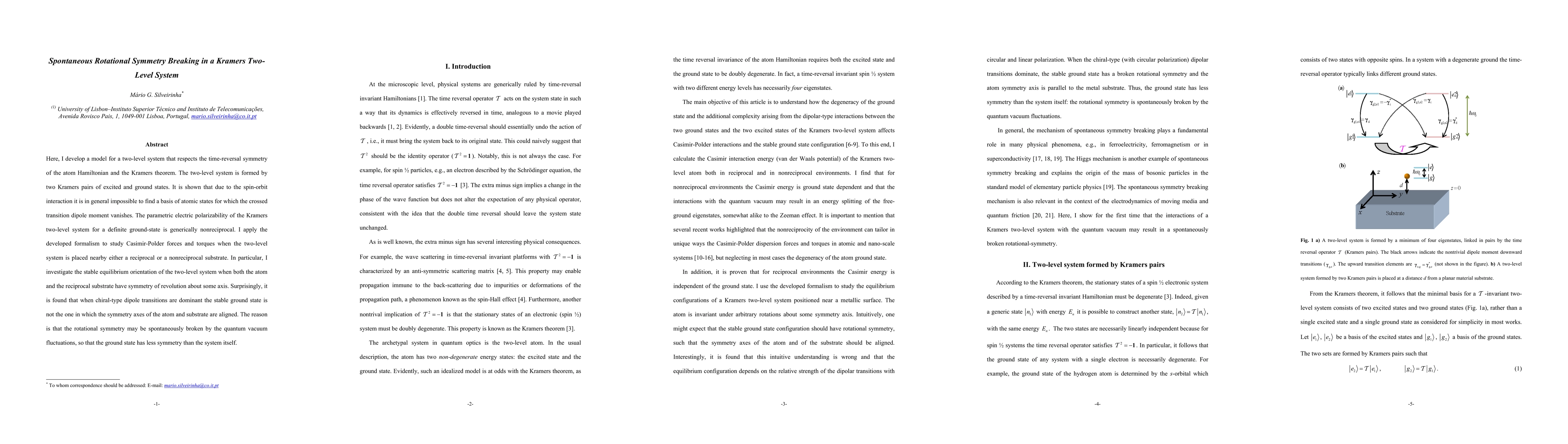 Here, I develop a model for a two-level system that respects the time-reversal symmetry of the atom Hamiltonian and the Kramers theorem. The two-level system is formed by two Kramers pairs of excited and ground states. It is shown that due to the spin-orbit interaction it is in general impossible to find a basis of atomic states for which the crossed transition dipole moment vanishes. The parametric electric polarizability of the Kramers two-level system for a definite ground-state is generically nonreciprocal. I apply the developed formalism to study Casimir-Polder forces and torques when the two-level system is placed nearby either a reciprocal or a nonreciprocal substrate. In particular, I investigate the stable equilibrium orientation of the two-level system when both the atom and the reciprocal substrate have symmetry of revolution about some axis. Surprisingly, it is found that when chiral-type dipole transitions are dominant the stable ground state is not the one in which the symmetry axes of the atom and substrate are aligned. The reason is that the rotational symmetry may be spontaneously broken by the quantum vacuum fluctuations, so that the ground state has less symmetry than the system itself.