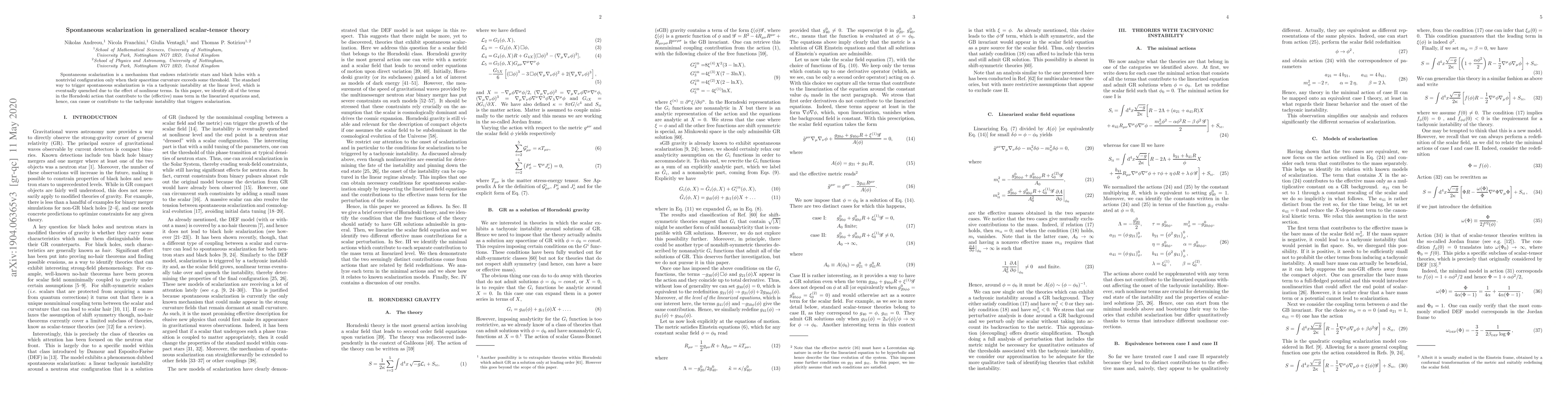 This paper explores spontaneous scalarization in generalised scalar-tensor theory, identifying terms in the Horndeski action that contribute to the effective mass term, leading to tachyonic instability and triggering scalarization in relativistic stars and black holes when spacetime curvature exceeds a threshold.