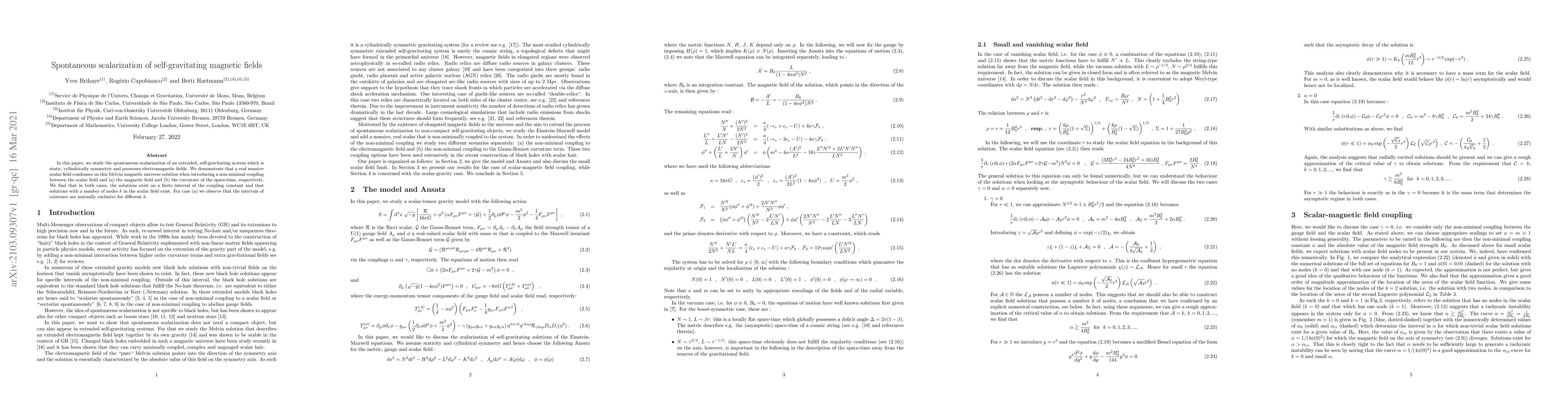 In this paper, we study the spontaneous scalarization of an extended, self-gravitating system which is static, cylindrically symmetric and possesses electromagnetic fields. We demonstrate that a real massive scalar field condenses on this Melvin magnetic universe solution when introducing a non-minimal coupling between the scalar field and (a) the magnetic field and (b) the curvature of the space-time, respectively. We find that in both cases, the solutions exist on a finite interval of the coupling constant and that solutions with a number of nodes $k$ in the scalar field exist. For case (a) we observe that the intervals of existence are mutually exclusive for different $k$.