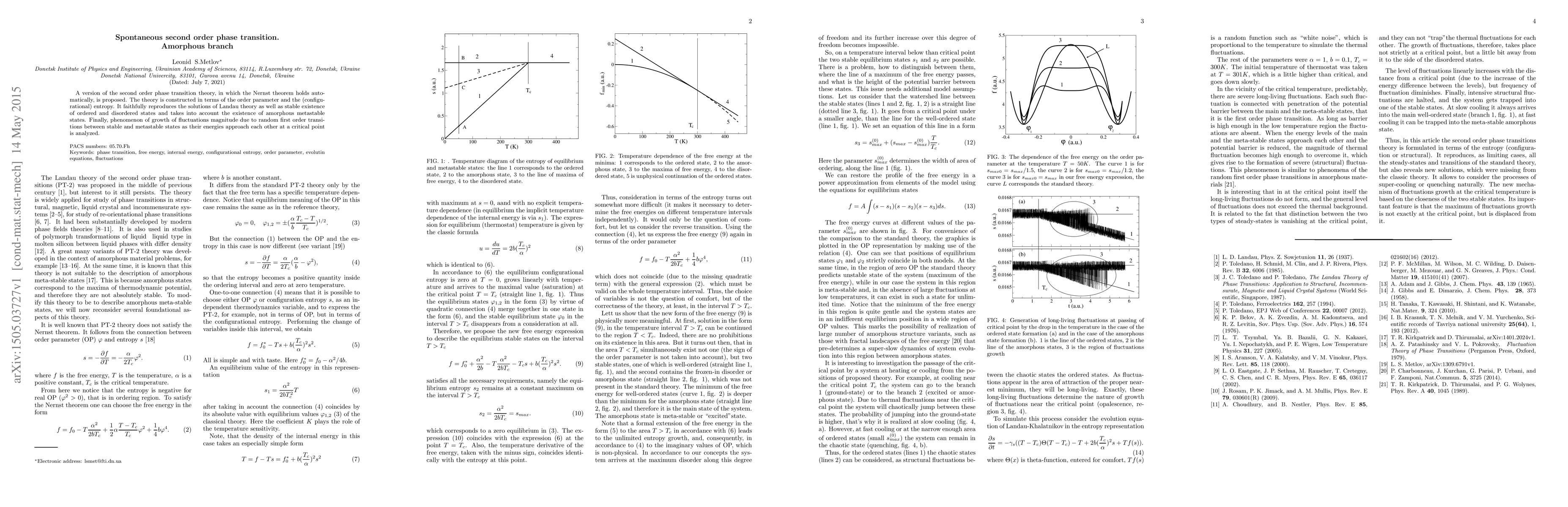 A version of the second order phase transition theory, in which the Nernst theorem holds automatically, is proposed. The theory is constructed in terms of the order parameter and the (configurational) entropy. It faithfully reproduces the solutions of Landau theory as well as stable existence of ordered and disordered states and takes into account the existence of amorphous metastable states. Finally, phenomenon of growth of fluctuations magnitude due to random first order transitions between stable and metastable states as their energies approach each other at a critical point is analyzed.