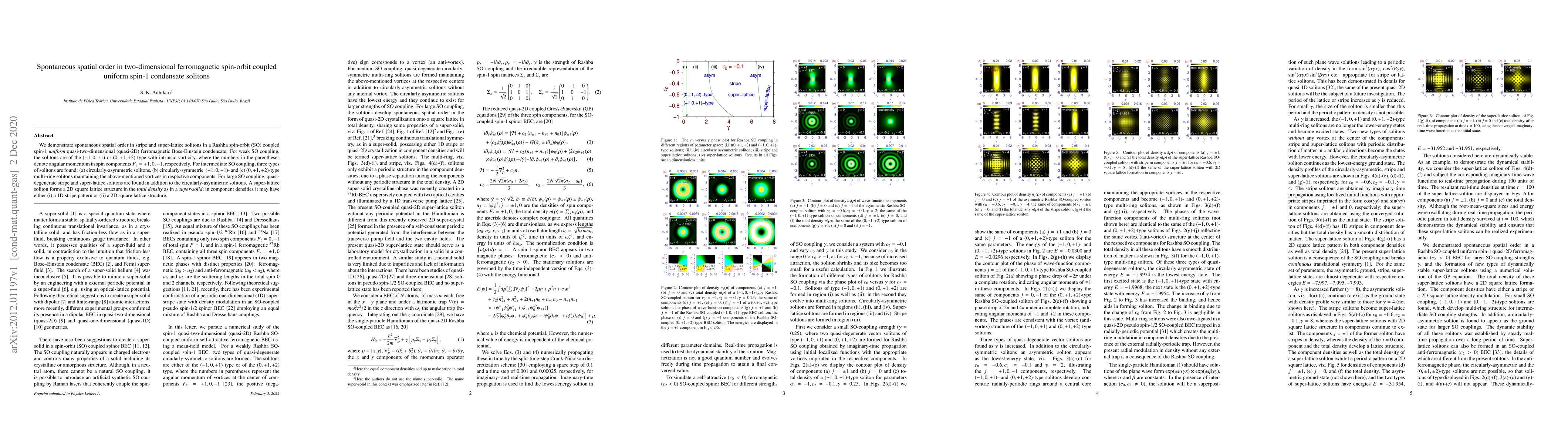 We demonstrate spontaneous spatial order in stripe and super-lattice solitons in a Rashba spin-orbit (SO) coupled spin-1 uniform quasi-two-dimensional (quasi-2D) ferromagnetic Bose-Einstein condensate. For weak SO coupling, the solitons are of the $(- 1,0,+ 1)$ or $(0,+ 1,+ 2)$ type with intrinsic vorticity, where the numbers in the parentheses denote angular momentum in spin components $F_z=+1,0,-1$, respectively. For intermediate SO coupling, three types of solitons are found: (a) circularly-asymmetric solitons, (b) circularly-symmetric $(- 1,0,+ 1)$- and (c) $(0,+ 1,+ 2)$-type multi-ring solitons maintaining the above-mentioned vortices in respective components. For large SO coupling, quasi-degenerate stripe and super-lattice solitons are found in addition to the circularly-asymmetric solitons. A super-lattice soliton forms a 2D square lattice structure in the total density as in a super-solid; in component densities it may have either (i) a 1D stripe pattern or (ii) a 2D square lattice structure.