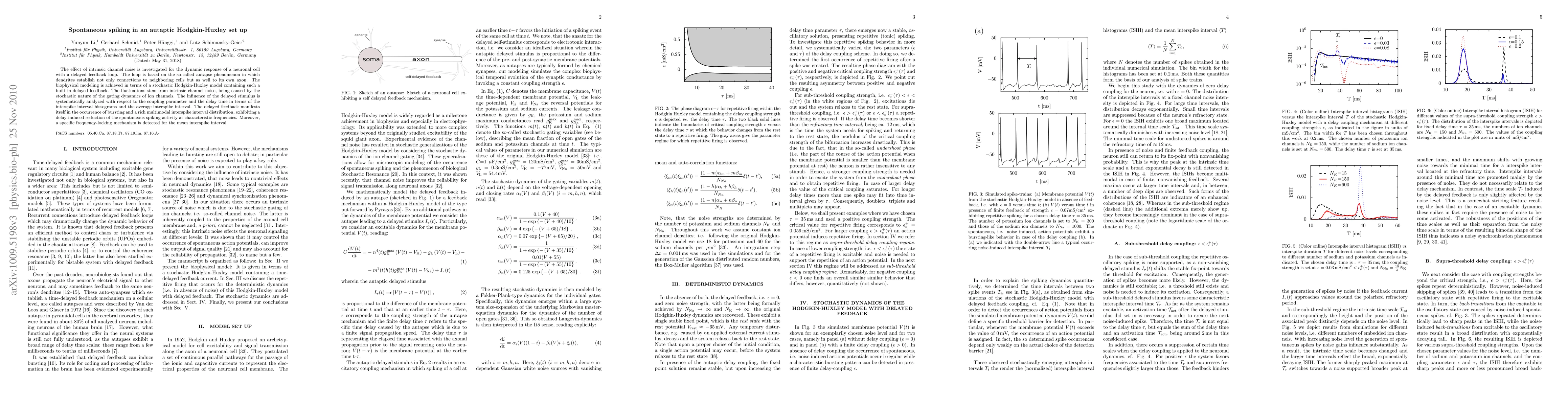 The effect of intrinsic channel noise is investigated for the dynamic response of a neuronal cell with a delayed feedback loop. The loop is based on the so-called autapse phenomenon in which dendrites establish not only connections to neighboring cells but as well to its own axon. The biophysical modeling is achieved in terms of a stochastic Hodgkin-Huxley model containing such a built in delayed feedback. The fluctuations stem from intrinsic channel noise, being caused by the stochastic nature of the gating dynamics of ion channels. The influence of the delayed stimulus is systematically analyzed with respect to the coupling parameter and the delay time in terms of the interspike interval histograms and the average interspike interval. The delayed feedback manifests itself in the occurrence of bursting and a rich multimodal interspike interval distribution, exhibiting a delay-induced reduction of the spontaneous spiking activity at characteristic frequencies. Moreover, a specific frequency-locking mechanism is detected for the mean interspike interval.