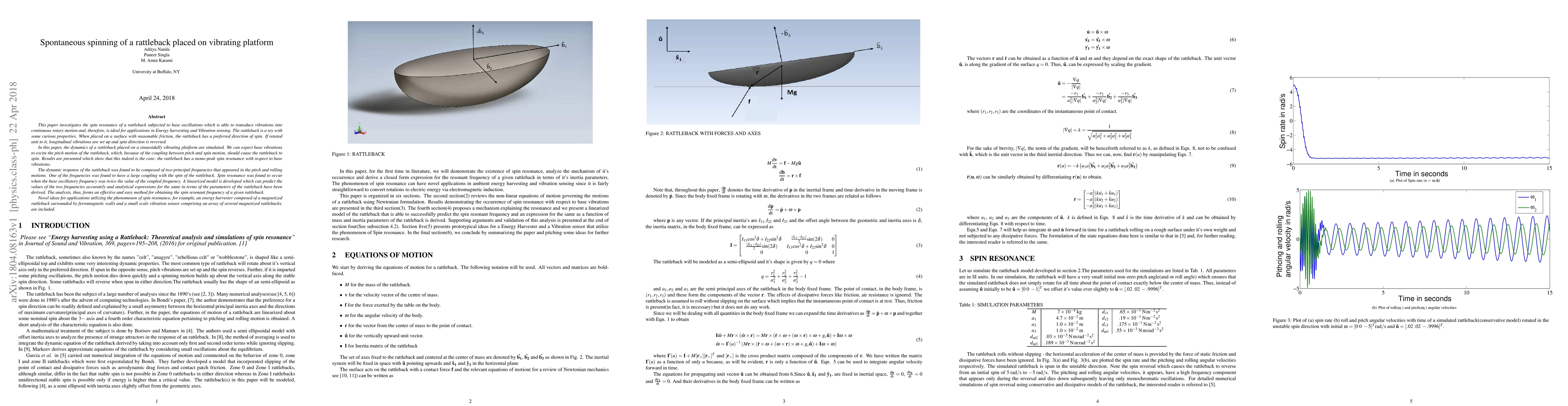 The spontaneous spinning of a rattleback placed on a vibrating platform is investigated. The rattleback is a toy with some curious properties. When placed on a surface with reasonable friction, the rattleback has a preferred direction of spin. If rotated anti to it, longitudinal vibrations are set up and spin direction is reversed. In this paper, the dynamics of a rattleback placed on a sinusoidally vibrating platform are simulated. We can expect base vibrations to excite the pitch motion of the rattleback, which, because of the coupling between pitch and spin motion, should cause the rattleback to spin. Results are presented which show that this indeed is the case- the rattleback has a mono-peak spin resonance with respect to base vibrations. The rattleback, thus, transduces translating vibrations into continuous rotary motion and, therefore, is ideal for applications in Energy harvesting and Vibration sensing. The dynamic response of the rattleback was found to be composed of two principal frequencies that appeared in the pitch and rolling motions. One of the frequencies was found to have a large coupling with the spin of the rattleback. Spin resonance was found to occur when the base oscillatory frequency was twice the value of the coupled frequency. A linearized model is developed which can predict the values of the two frequencies accurately and analytical expressions for the same in terms of the parameters of the rattleback have been derived. The analysis, thus, forms an effective and easy method for obtaining the spin resonant frequency of a given rattleback. Novel ideas for applications utilizing the phenomenon of spin resonance, for example, an energy harvester composed of a magnetized rattleback surrounded by ferromagnetic walls and a small scale vibration sensor comprising an array of several magnetized rattlebacks, are included.