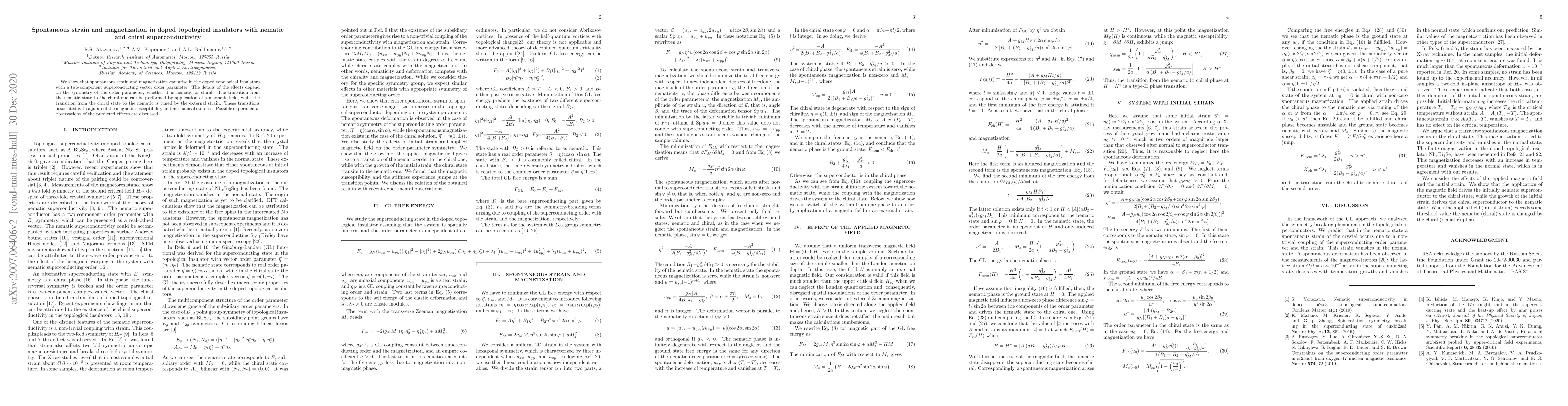 This paper demonstrates that doped topological insulators can exhibit spontaneous strain and magnetization linked to their superconducting order parameters, which can be nematic or chiral. Transitions between these states can be induced by magnetic fields or external strain, accompanied by changes in magnetic susceptibility and mechanical stiffness.