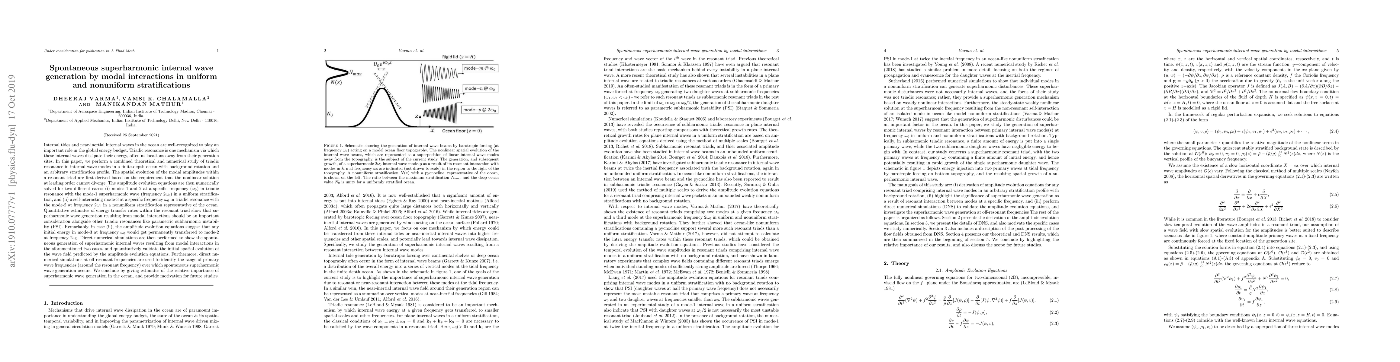This paper investigates spontaneous superharmonic internal wave generation through triadic resonance in both uniform and nonuniform ocean stratifications. Theoretical and numerical analyses reveal significant energy transfer rates and the permanent transfer of energy from mode-3 to mode-2 in nonuniform stratification, validated by direct numerical simulations.