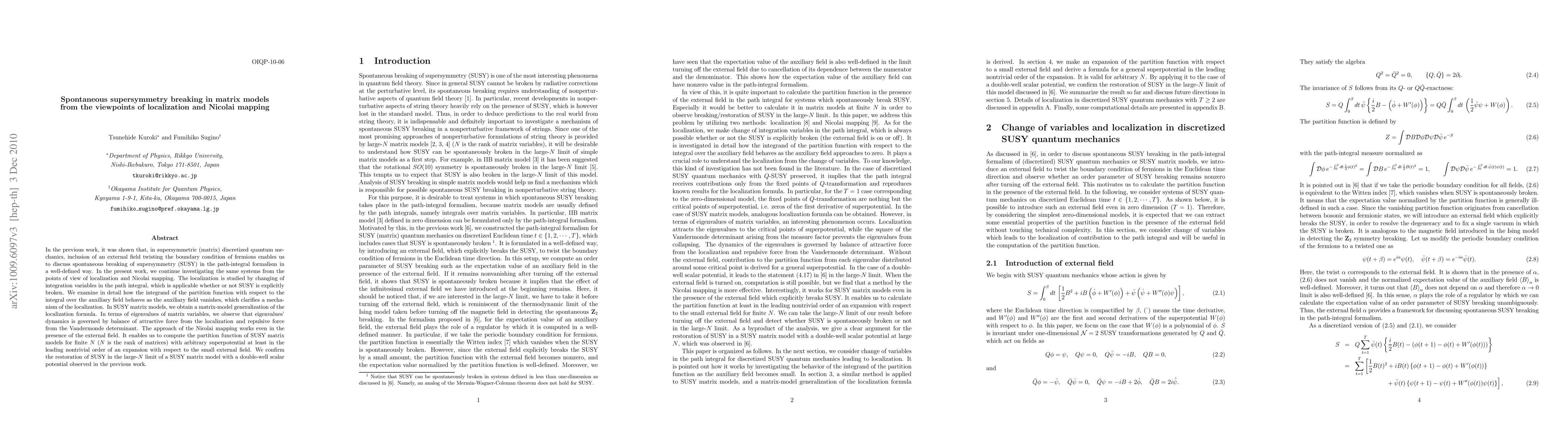 This paper investigates spontaneous supersymmetry breaking in matrix models through localization and Nicolai mapping techniques. It demonstrates how localization clarifies the dynamics of eigenvalues and generalizes the localization formula for SUSY matrix models, while Nicolai mapping allows computation of partition functions for finite N with arbitrary superpotentials, confirming the restoration of SUSY in the large-N limit.