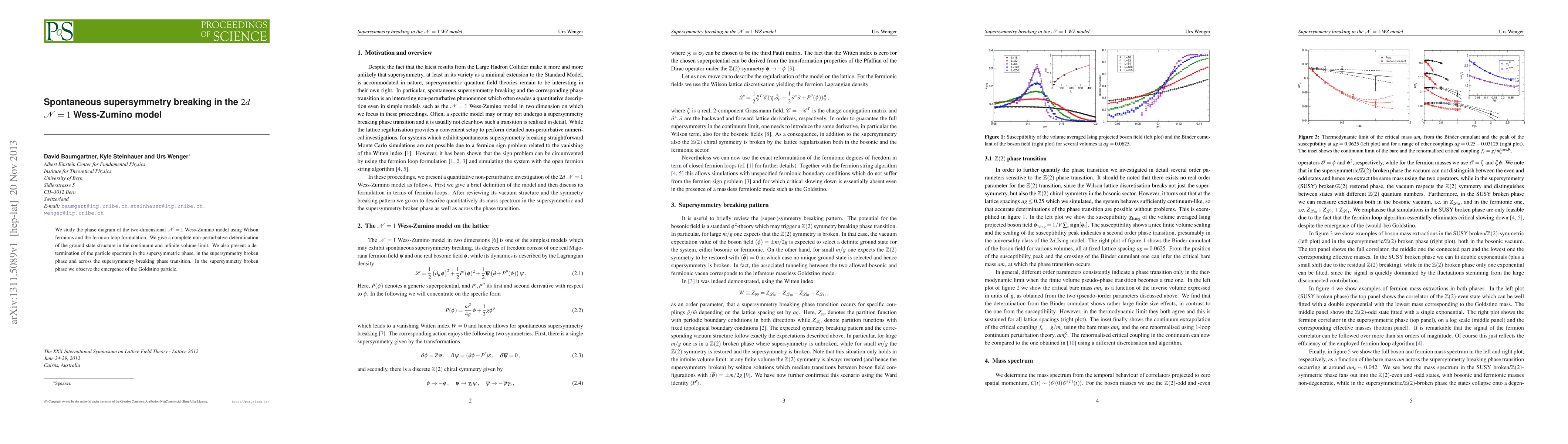 This paper investigates the phase diagram of the 2d N=1 Wess-Zumino model, revealing spontaneous supersymmetry breaking through non-perturbative methods. It identifies the Goldstino particle emerging in the broken supersymmetry phase and provides a complete spectrum determination across different phases.