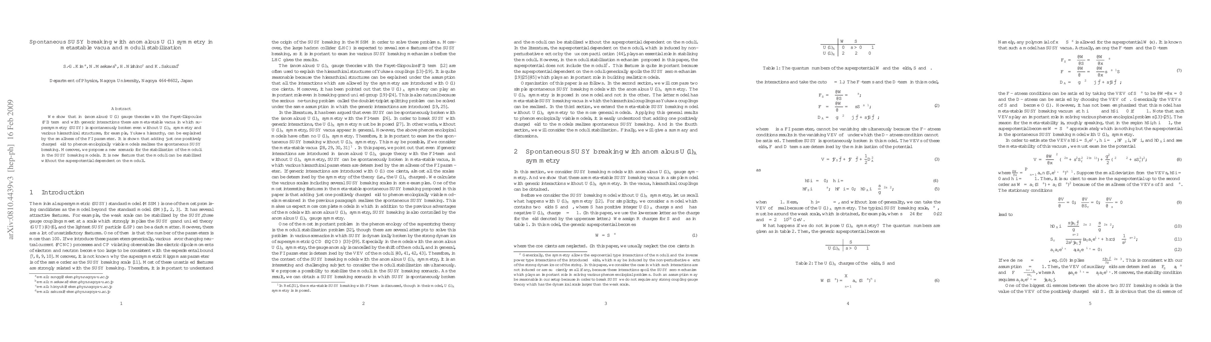 This paper demonstrates that in anomalous U(1) gauge theories with the Fayet-Iliopoulos term, spontaneous SUSY breaking can occur in metastable vacua without U(1)_R symmetry. It also proposes a new method for moduli stabilization in SUSY breaking models, explaining hierarchical structures through the smallness of the FI parameter and determining various scales via U(1) charges.