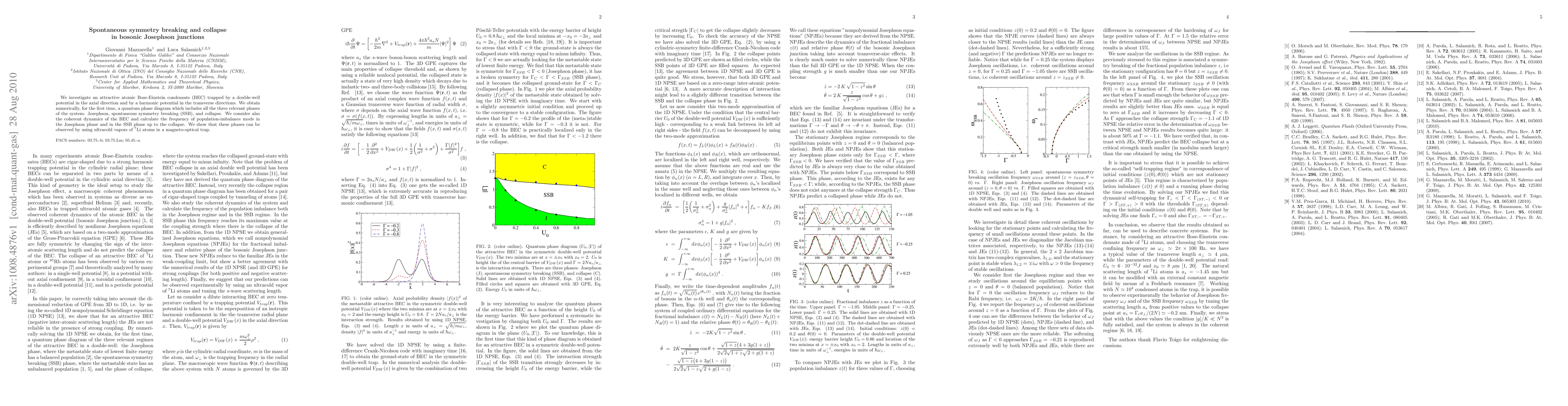 We investigate an attractive atomic Bose-Einstein condensate (BEC) trapped by a double-well potential in the axial direction and by a harmonic potential in the transverse directions. We obtain numerically, for the first time, a quantum phase diagram which includes all the three relevant phases of the system: Josephson, spontaneous symmetry breaking (SSB), and collapse. We consider also the coherent dynamics of the BEC and calculate the frequency of population-imbalance mode in the Josephson phase and in the SSB phase up to the collapse. We show that these phases can be observed by using ultracold vapors of 7Li atoms in a magneto-optical trap.
