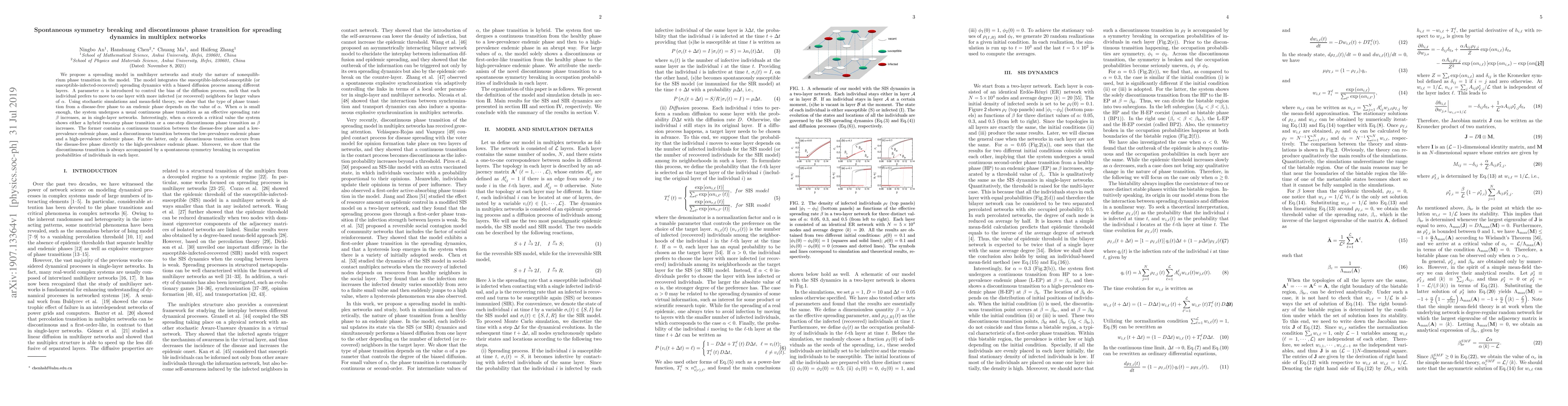 This paper proposes a spreading model in multilayer networks that combines susceptible-infected dynamics with biased diffusion, and finds that the phase transition type depends on the diffusion bias parameter $\alpha$. For small $\alpha$, the transition is continuous, but for larger $\alpha$, the system exhibits either a hybrid two-step or a one-step discontinuous transition, with the latter accompanied by spontaneous symmetry breaking.