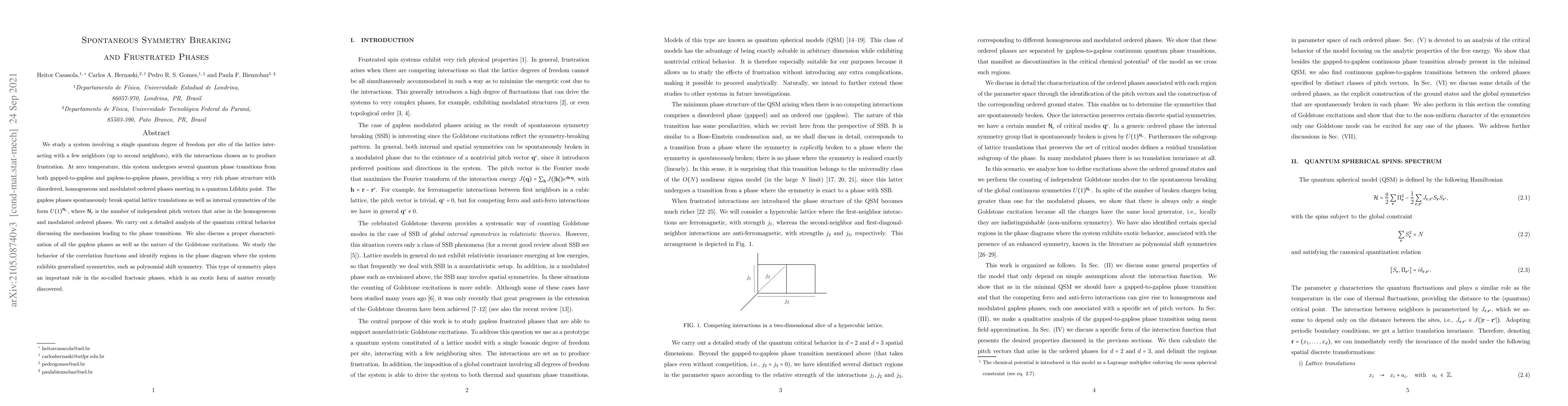 We study a system involving a single quantum degree of freedom per site of the lattice interacting with a few neighbors (up to second neighbors), with the interactions chosen as to produce frustration. At zero temperature, this system undergoes several quantum phase transitions from both gapped-to-gapless and gapless-to-gapless phases, providing a very rich phase structure with disordered, homogeneous and modulated ordered phases meeting in a quantum Lifshitz point. The gapless phases spontaneously break spatial lattice translations as well as internal symmetries of the form $U(1)^{\mathsf{N}_c}$, where $\mathsf{N}_c$ is the number of independent pitch vectors that arise in the homogeneous and modulated ordered phases. We carry out a detailed analysis of the quantum critical behavior discussing the mechanism leading to the phase transitions. We also discuss a proper characterization of all the gapless phases as well as the nature of the Goldstone excitations. We study the behavior of the correlation functions and identify regions in the phase diagram where the system exhibits generalized symmetries, such as polynomial shift symmetry. This type of symmetry plays an important role in the so-called fractonic phases, which is an exotic form of matter recently discovered.