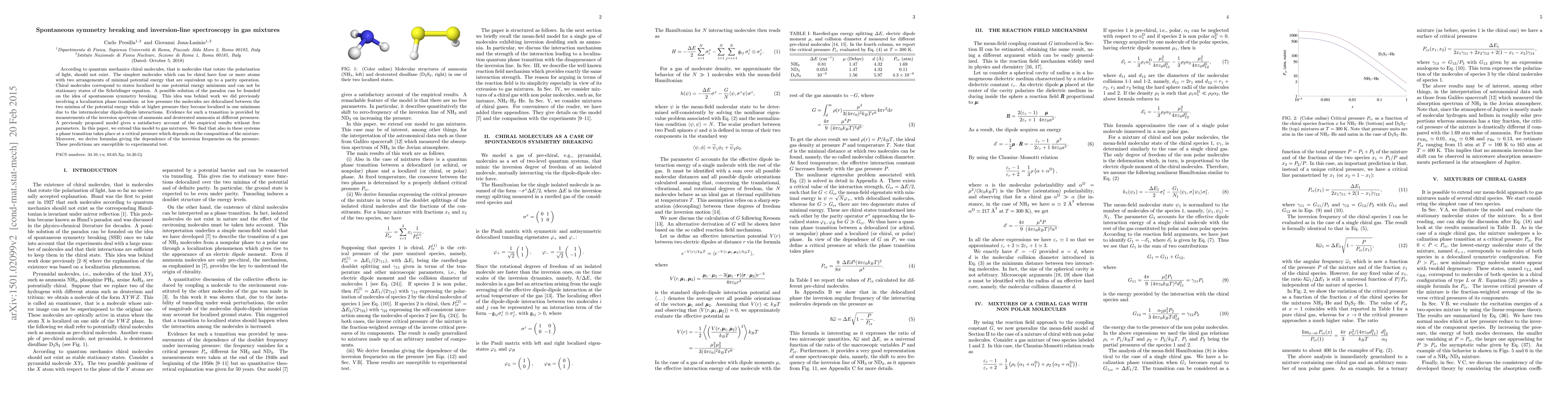 According to quantum mechanics chiral molecules, that is molecules that rotate the polarization of light, should not exist. The simplest molecules which can be chiral have four or more atoms with two arrangements of minimal potential energy that are equivalent up to a parity operation. Chiral molecules correspond to states localized in one potential energy minimum and can not be stationary states of the Schr\"odinger equation. A possible solution of the paradox can be founded on the idea of spontaneous symmetry breaking. This idea was behind work we did previously involving a localization phase transition: at low pressure the molecules are delocalized between the two minima of the potential energy while at higher pressure they become localized in one minimum due to the intermolecular dipole-dipole interactions. Evidence for such a transition is provided by measurements of the inversion spectrum of ammonia and deuterated ammonia at different pressures. A previously proposed model gives a satisfactory account of the empirical results without free parameters. In this paper, we extend this model to gas mixtures. We find that also in these systems a phase transition takes place at a critical pressure which depends on the composition of the mixture. Moreover, we derive formulas giving the dependence of the inversion frequencies on the pressure. These predictions are susceptible to experimental test.
