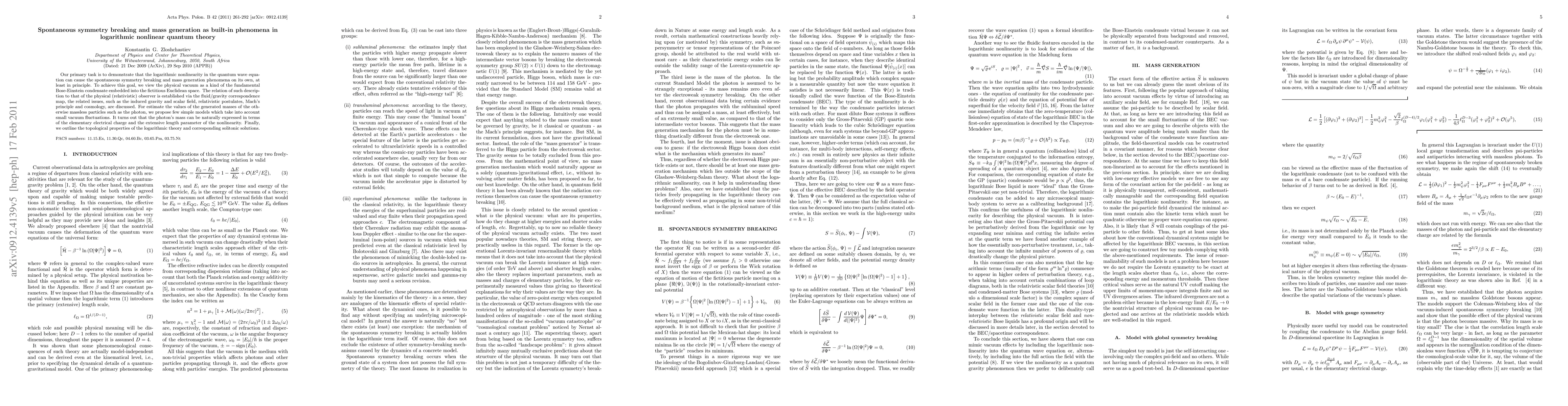 Our primary task is to demonstrate that the logarithmic nonlinearity in the quantum wave equation can cause the spontaneous symmetry breaking and mass generation phenomena on its own, at least in principle. To achieve this goal, we view the physical vacuum as a kind of the fundamental Bose-Einstein condensate embedded into the fictitious Euclidean space. The relation of such description to that of the physical (relativistic) observer is established via the fluid/gravity correspondence map, the related issues, such as the induced gravity and scalar field, relativistic postulates, Mach's principle and cosmology, are discussed. For estimate the values of the generated masses of the otherwise massless particles such as the photon, we propose few simple models which take into account small vacuum fluctuations. It turns out that the photon's mass can be naturally expressed in terms of the elementary electrical charge and the extensive length parameter of the nonlinearity. Finally, we outline the topological properties of the logarithmic theory and corresponding solitonic solutions.