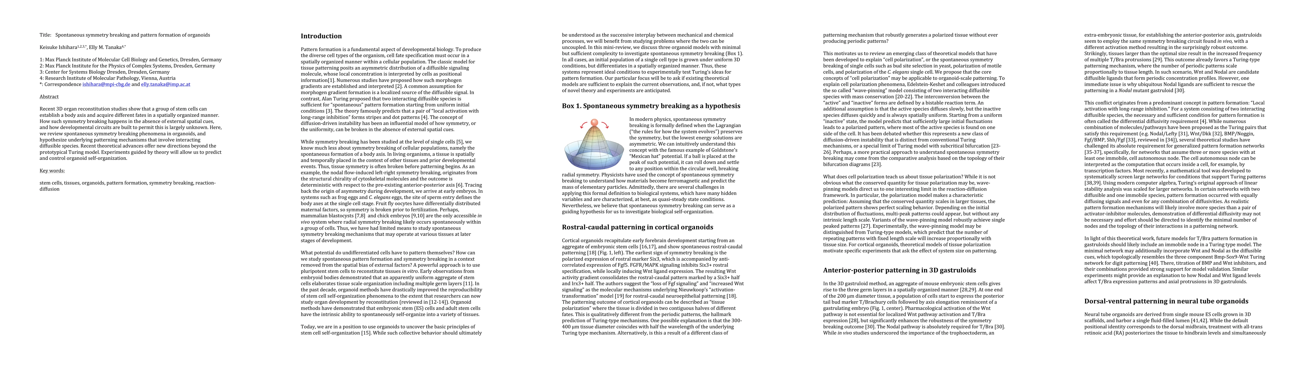Recent 3D organ reconstitution studies show that a group of stem cells can establish a body axis and acquire different fates in a spatially organized manner. How such symmetry breaking happens in the absence of external spatial cues, and how developmental circuits are built to permit this is largely unknown. Here, we review spontaneous symmetry breaking phenomena in organoids, and hypothesize underlying patterning mechanisms that involve interacting diffusible species. Recent theoretical advances offer new directions beyond the prototypical Turing model. Experiments guided by theory will allow us to predict and control organoid self-organization.