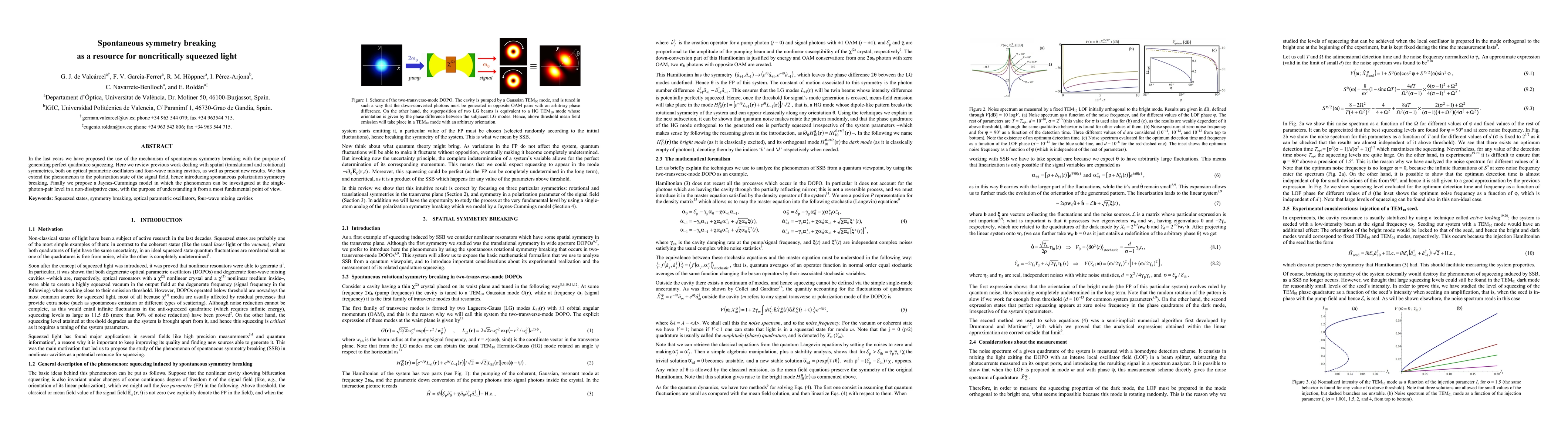 In the last years we have proposed the use of the mechanism of spontaneous symmetry breaking with the purpose of generating perfect quadrature squeezing. Here we review previous work dealing with spatial (translational and rotational) symmetries, both on optical parametric oscillators and four-wave mixing cavities, as well as present new results. We then extend the phenomenon to the polarization state of the signal field, hence introducing spontaneous polarization symmetry breaking. Finally we propose a Jaynes-Cummings model in which the phenomenon can be investigated at the single-photon-pair level in a non-dissipative case, with the purpose of understanding it from a most fundamental point of view.