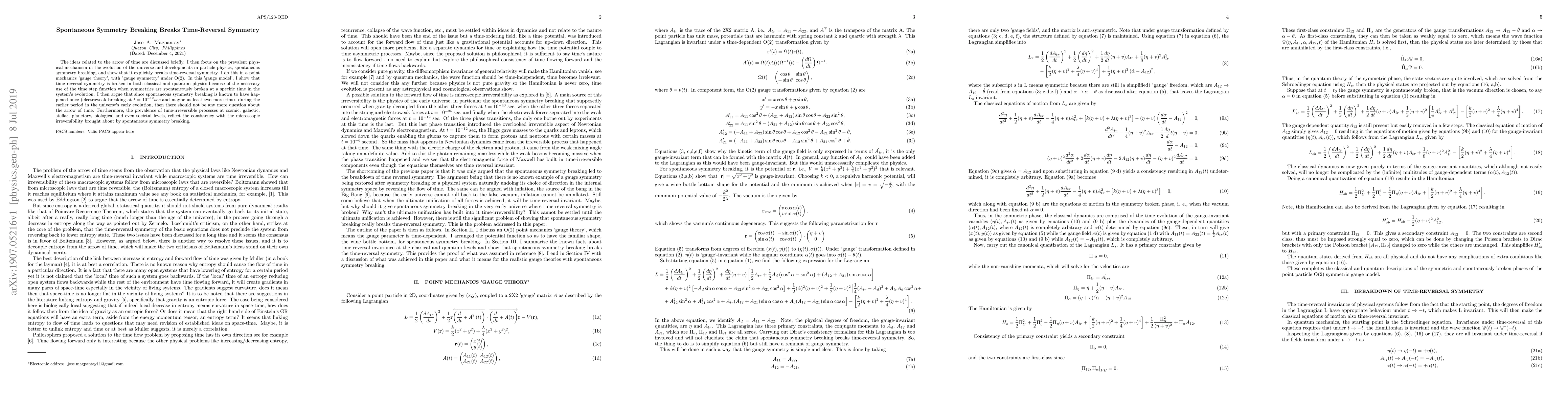 This paper explores how spontaneous symmetry breaking in point mechanics gauge theory with an O(2) symmetry group explicitly breaks time-reversal symmetry, providing a mechanism for the arrow of time in the universe. The proof leverages a time step function in the Lagrangian to demonstrate this breakdown.