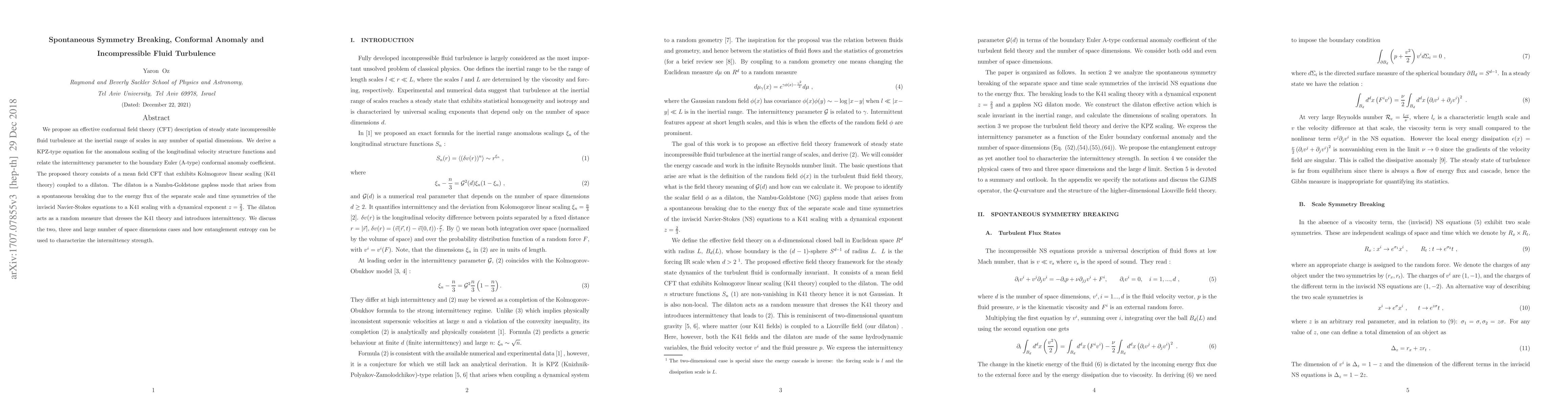 We propose an effective conformal field theory (CFT) description of steady state incompressible fluid turbulence at the inertial range of scales in any number of spatial dimensions. We derive a KPZ-type equation for the anomalous scaling of the longitudinal velocity structure functions and relate the intermittency parameter to the boundary Euler (A-type) conformal anomaly coefficient. The proposed theory consists of a mean field CFT that exhibits Kolmogorov linear scaling (K41 theory) coupled to a dilaton. The dilaton is a Nambu-Goldstone gapless mode that arises from a spontaneous breaking due to the energy flux of the separate scale and time symmetries of the inviscid Navier-Stokes equations to a K41 scaling with a dynamical exponent $z=\frac{2}{3}$. The dilaton acts as a random measure that dresses the K41 theory and introduces intermittency. We discuss the two, three and large number of space dimensions cases and how entanglement entropy can be used to characterize the intermittency strength.