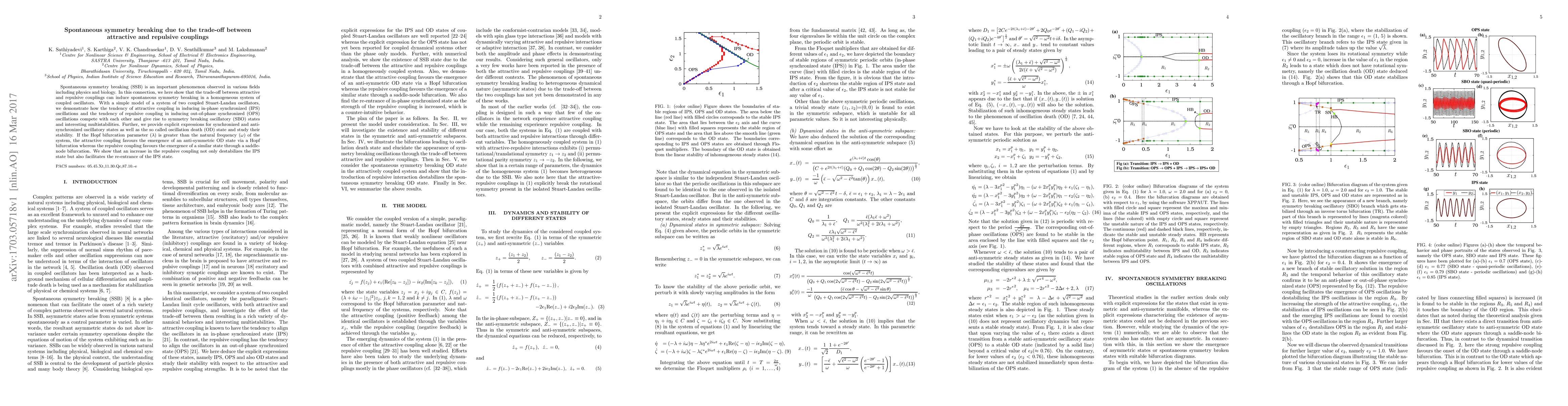 Spontaneous symmetry breaking (SSB) is an important phenomenon observed in various fields including physics and biology. In this connection, we here show that the trade-off between attractive and repulsive couplings can induce spontaneous symmetry breaking in a homogeneous system of coupled oscillators. With a simple model of a system of two coupled Stuart-Landau oscillators, we demonstrate how the tendency of attractive coupling in inducing in-phase synchronized (IPS) oscillations and the tendency of repulsive coupling in inducing out-of-phase synchronized (OPS) oscillations compete with each other and give rise to symmetry breaking oscillatory (SBO) states and interesting multistabilities. Further, we provide explicit expressions for synchronized and anti-synchronized oscillatory states as well as the so called oscillation death (OD) state and study their stability. If the Hopf bifurcation parameter (${\lambda}$) is greater than the natural frequency ($\omega$) of the system, the attractive coupling favours the emergence of an anti-symmetric OD state via a Hopf bifurcation whereas the repulsive coupling favours the emergence of a similar state through a saddle-node bifurcation. We show that an increase in the repulsive coupling not only destabilizes the IPS state but also facilitates the re-entrance of the IPS state.