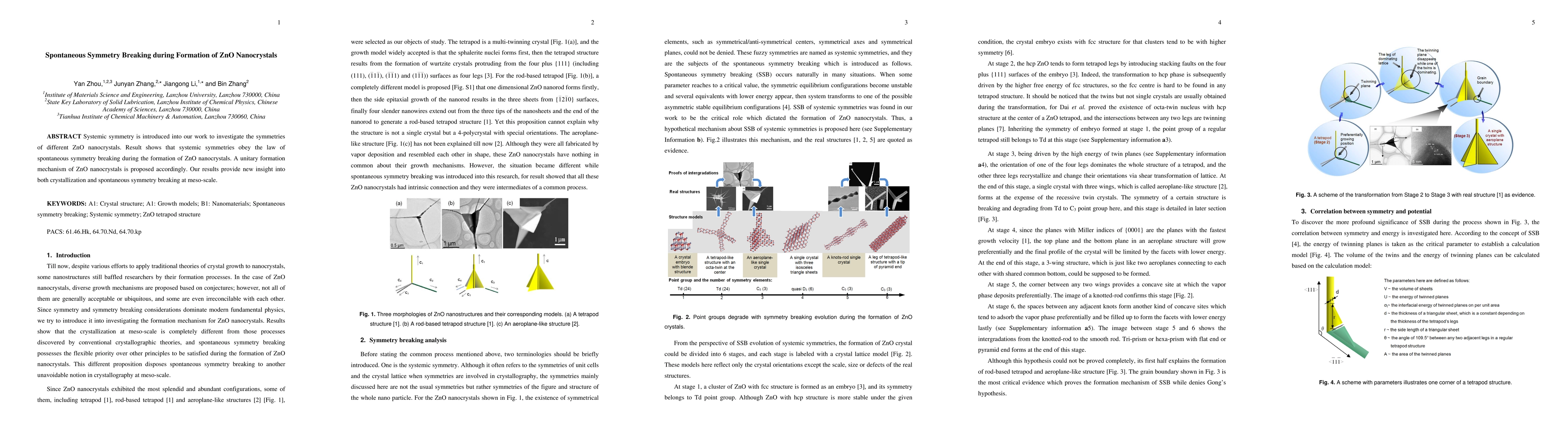 This paper investigates the symmetries of ZnO nanocrystals and reveals spontaneous symmetry breaking during their formation, proposing a unified formation mechanism. The findings offer new insights into crystallization and symmetry breaking at the meso-scale.