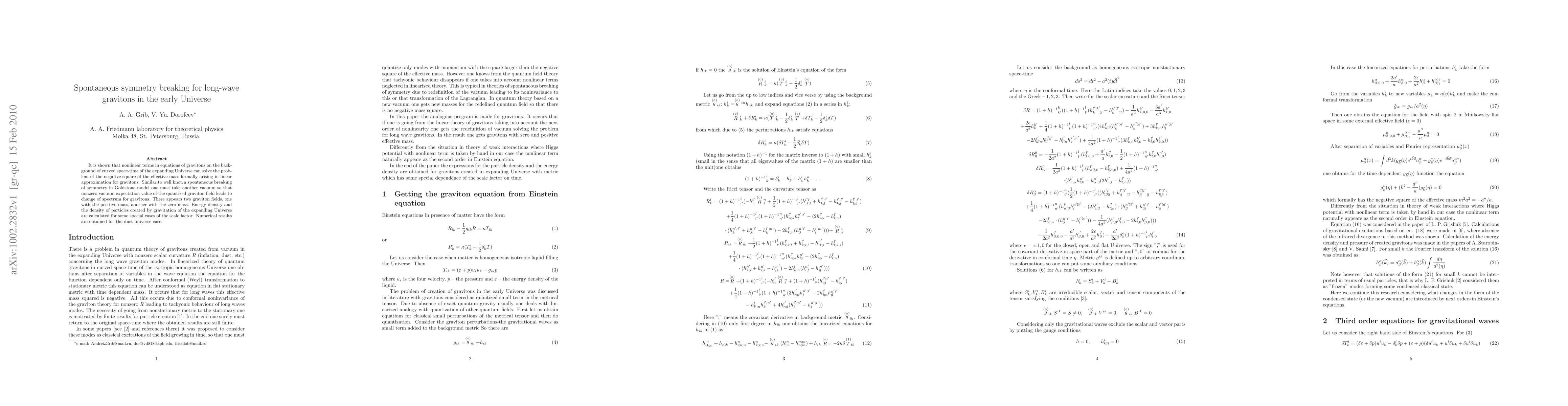 It is shown that nonlinear terms in equations of gravitons on the background of curved space-time of the expanding Universe can solve the problem of the negative square of the effective mass formally arising in linear approximation for gravitons. Similar to well known spontaneous breaking of symmetry in Goldstone model one must take another vacuum so that nonzero vacuum expectation value of the quantized graviton field leads to change of spectrum for gravitons. There appears two graviton fields, one with the positive mass, another with the zero mass. Energy density and the density of particles created by gravitation of the expanding Universe are calculated for some special cases of the scale factor. Numerical results are obtained for the dust universe case.