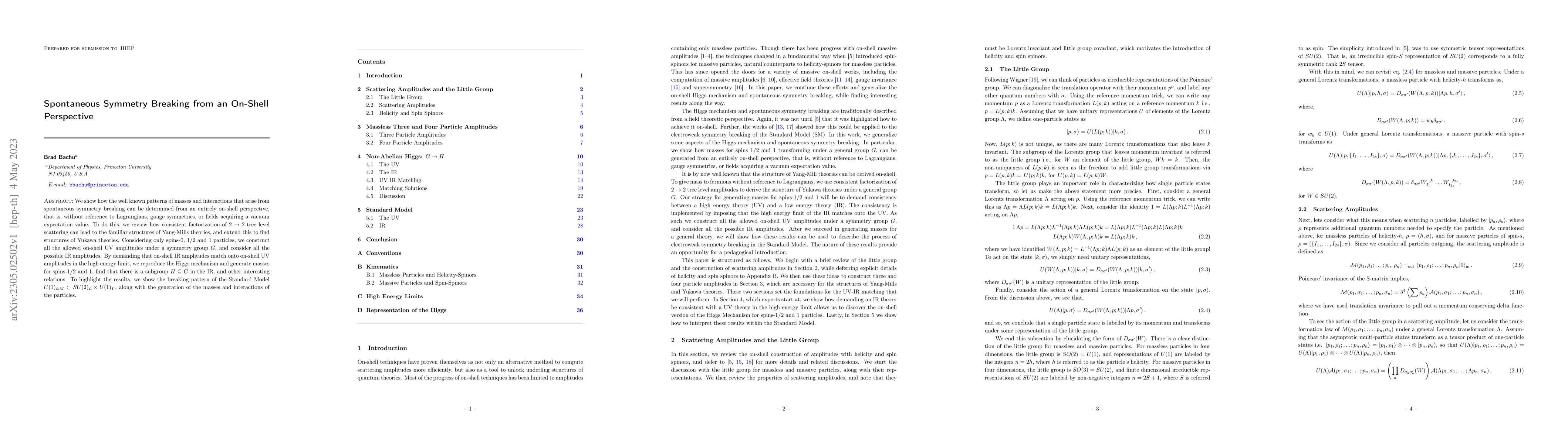 This paper demonstrates how spontaneous symmetry breaking can be understood purely from an on-shell perspective, revealing mass patterns and interactions without relying on Lagrangians or vacuum expectation values. It constructs on-shell amplitudes for various particle spins and shows how matching these amplitudes reproduces the Higgs mechanism and the Standard Model symmetry breaking pattern.
