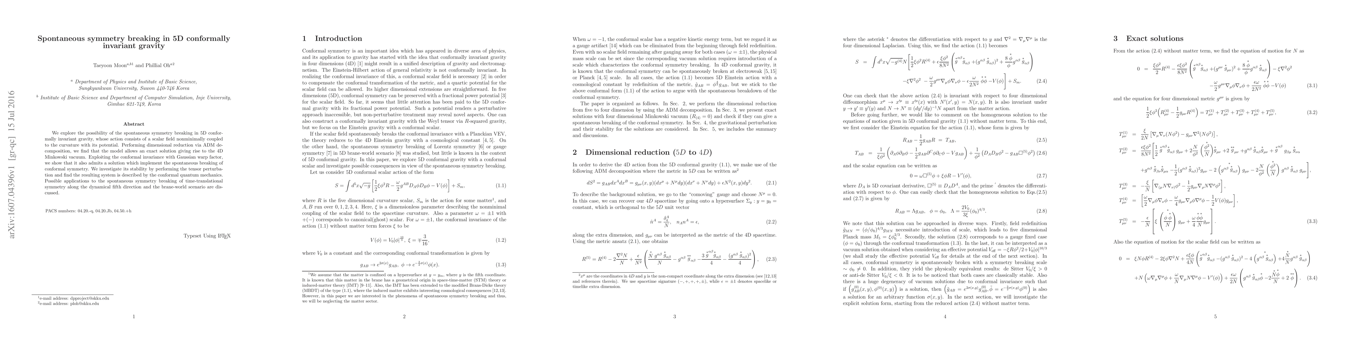 This paper investigates spontaneous symmetry breaking in 5D conformally invariant gravity, demonstrating via dimensional reduction that it yields a 4D Minkowski vacuum. The study further reveals solutions implementing conformal symmetry breaking and analyzes stability through tensor perturbations, finding a description by conformal quantum mechanics, with implications for time-translational symmetry breaking and brane-world scenarios.