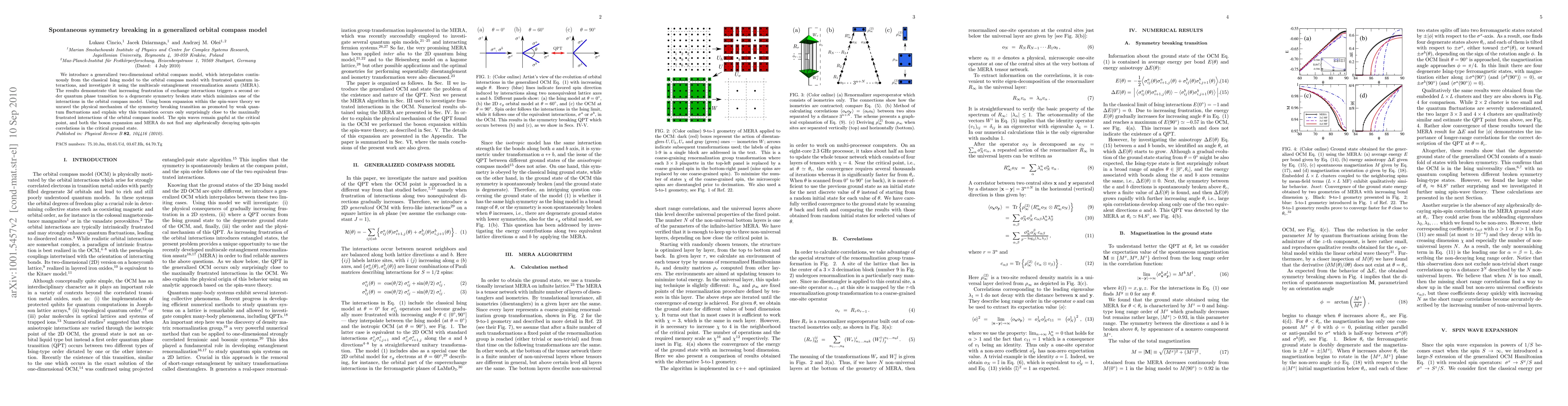 We introduce a generalized two-dimensional orbital compass model, which interpolates continuously from the classical Ising model to the orbital compass model with frustrated quantum interactions, and investigate it using the multiscale entanglement renormalization ansatz (MERA). The results demonstrate that increasing frustration of exchange interactions triggers a second order quantum phase transition to a degenerate symmetry broken state which minimizes one of the interactions in the orbital compass model. Using boson expansion within the spin-wave theory we unravel the physical mechanism of the symmetry breaking transition as promoted by weak quantum fluctuations and explain why this transition occurs only surprisingly close to the maximally frustrated interactions of the orbital compass model. The spin waves remain gapful at the critical point, and both the boson expansion and MERA do not find any algebraically decaying spin-spin correlations in the critical ground state.