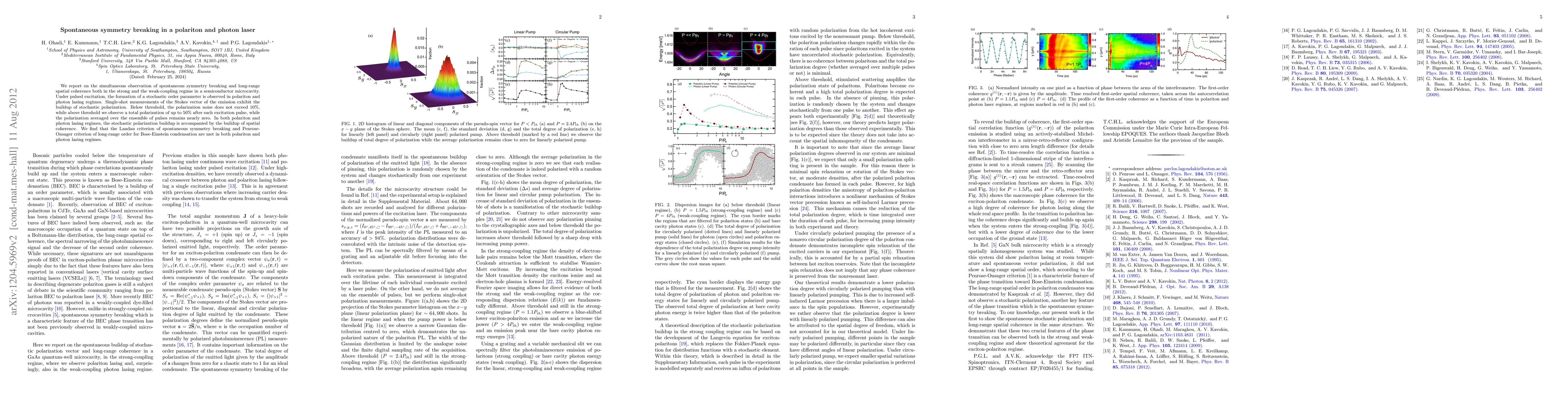 We report on the simultaneous observation of spontaneous symmetry breaking and long-range spatial coherence both in the strong and the weak-coupling regime in a semiconductor microcavity. Under pulsed excitation, the formation of a stochastic order parameter is observed in polariton and photon lasing regimes. Single-shot measurements of the Stokes vector of the emission exhibit the buildup of stochastic polarization. Below threshold, the polarization noise does not exceed 10%, while above threshold we observe a total polarization of up to 50% after each excitation pulse, while the polarization averaged over the ensemble of pulses remains nearly zero. In both polariton and photon lasing regimes, the stochastic polarization buildup is accompanied by the buildup of spatial coherence. We find that the Landau criterion of spontaneous symmetry breaking and Penrose-Onsager criterion of long-range order for Bose-Einstein condensation are met in both polariton and photon lasing regimes.