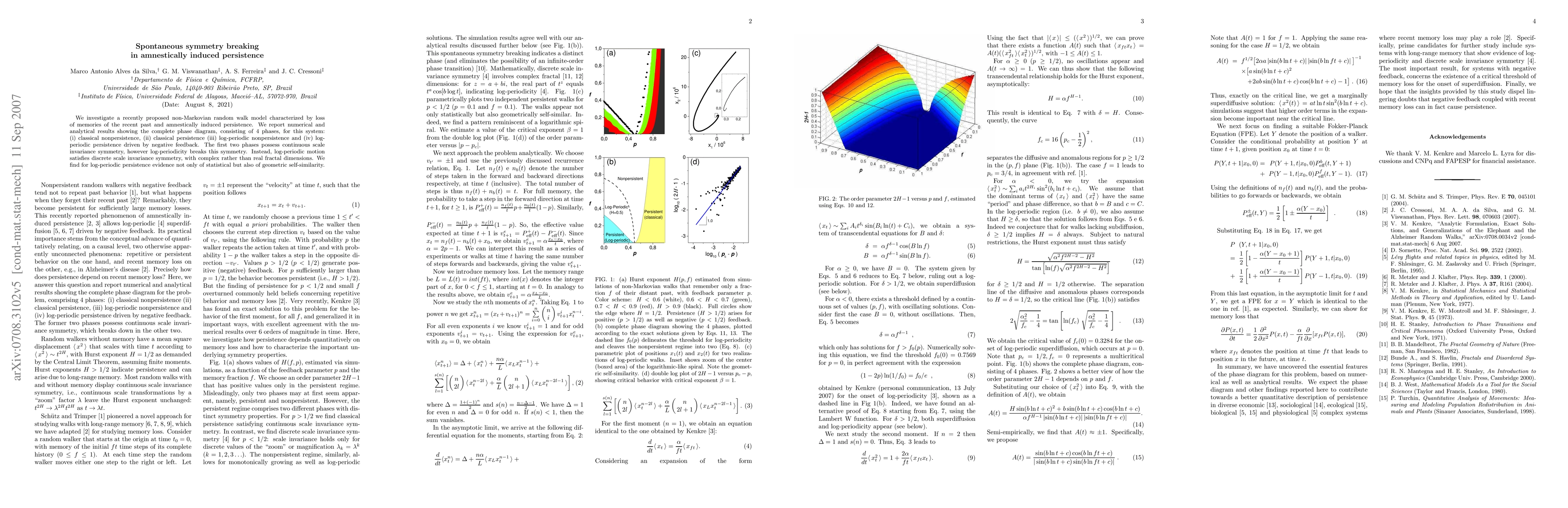 We investigate a recently proposed non-Markovian random walk model characterized by loss of memories of the recent past and amnestically induced persistence. We report numerical and analytical results showing the complete phase diagram, consisting of 4 phases, for this system: (i) classical nonpersistence, (ii) classical persistence (iii) log-periodic nonpersistence and (iv) log-periodic persistence driven by negative feedback. The first two phases possess continuous scale invariance symmetry, however log-periodicity breaks this symmetry. Instead, log-periodic motion satisfies discrete scale invariance symmetry, with complex rather than real fractal dimensions. We find for log-periodic persistence evidence not only of statistical but also of geometric self-similarity.