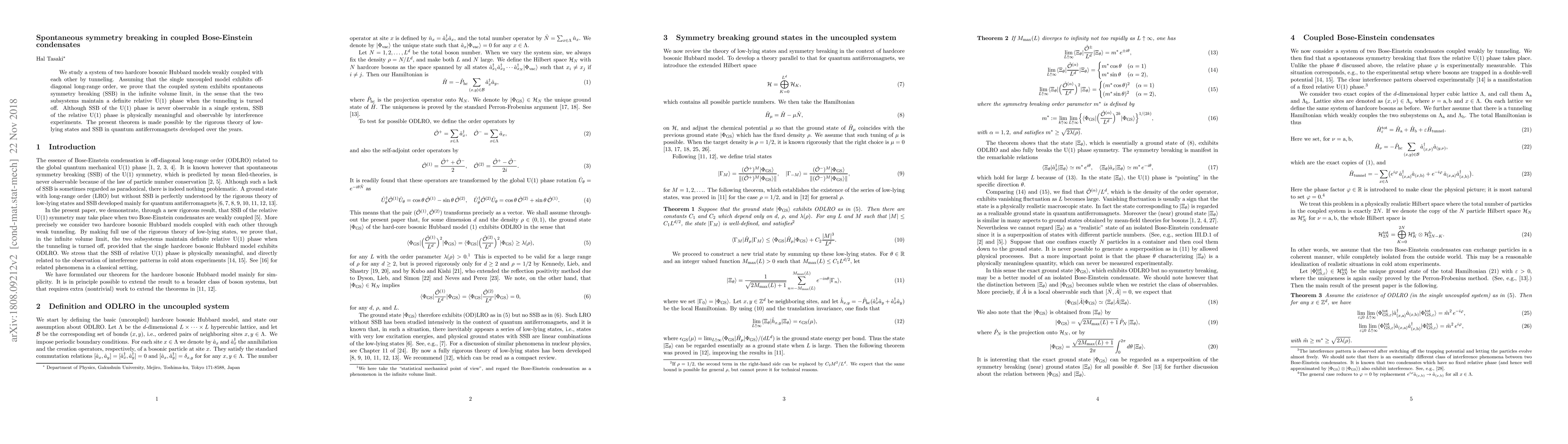 This paper proves that a coupled system of two weakly interacting hardcore bosonic Hubbard models exhibits spontaneous symmetry breaking (SSB) in the infinite volume limit, characterized by a definite relative U(1) phase between subsystems. This SSB, though not observable in a single system, can be detected through interference experiments.