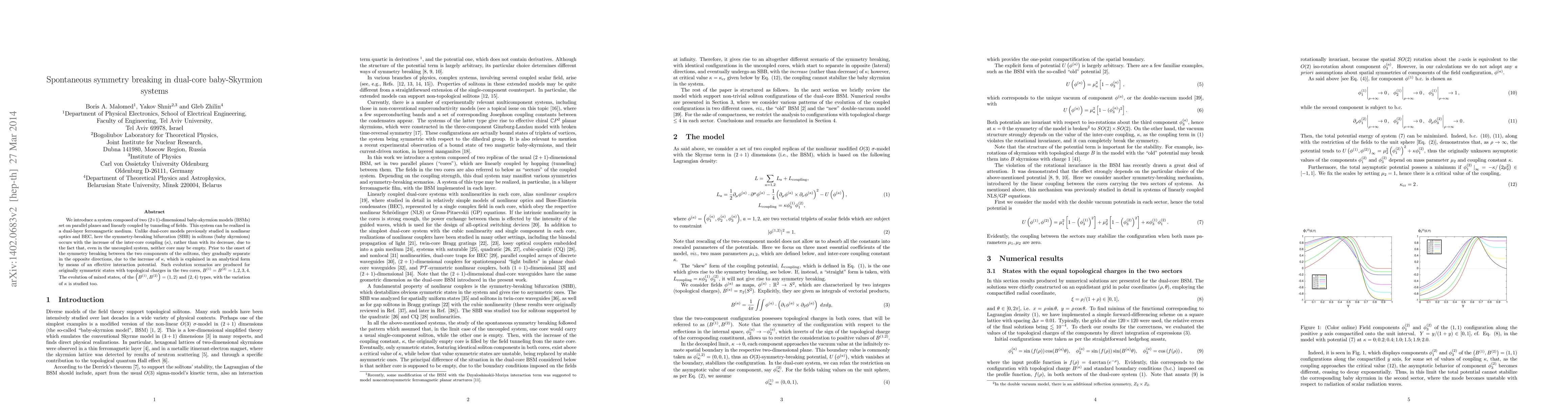 We introduce a system composed of two (2+1)-dimensional baby-skyrmion models (BSMs) set on parallel planes and linearly coupled by tunneling of fields. This system can be realized in a dual-layer ferromagnetic medium. Unlike dual-core models previously studied\ in nonlinear optics and BEC, here the symmetry-breaking bifurcation (SBB) in solitons (baby skyrmions) occurs with the increase of the inter-core coupling ($\kappa$), rather than with its decrease, due to the fact that even in the uncoupled system neither core may be empty. Prior to the onset of the symmetry breaking between the two components of the solitons, they gradually separate in the lateral direction, due to the increase of $\kappa$, which is explained in an analytical form by means of an effective interaction potential. Such evolution scenario are produced for the originally symmetric states with topological charges in the two cores $\left(B^{(1)},B^{(2)}\right)$, with $% B^{(1)}=B^{(2)}=1,2,3,4$. The evolution of mixed states, of the $\left(1,2\right)$ and $\left(2,4\right)$ types, with the variation of $\kappa$ is studied too.