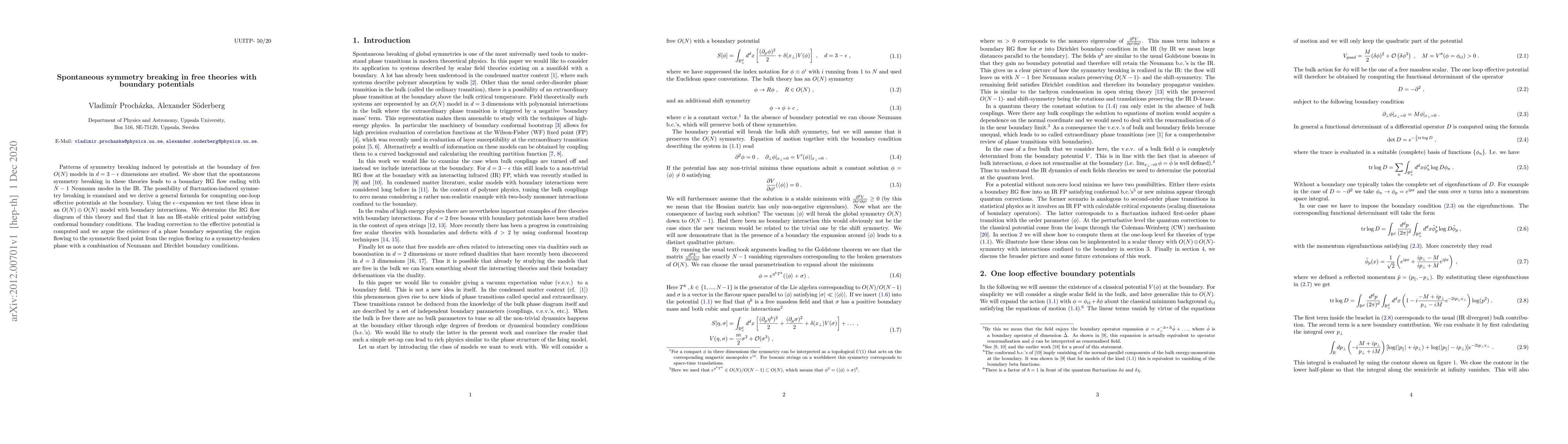 This paper investigates spontaneous symmetry breaking in free $O(N)$ models with boundary potentials in three dimensions, showing that it results in an RG flow with $N-1$ Neumann modes in the infrared. It derives a formula for one-loop effective potentials at the boundary and uses the $\epsilon$-expansion to explore an $O(N)\oplus O(N)$ model, identifying an IR-stable critical point and a phase boundary for symmetry-breaking transitions.