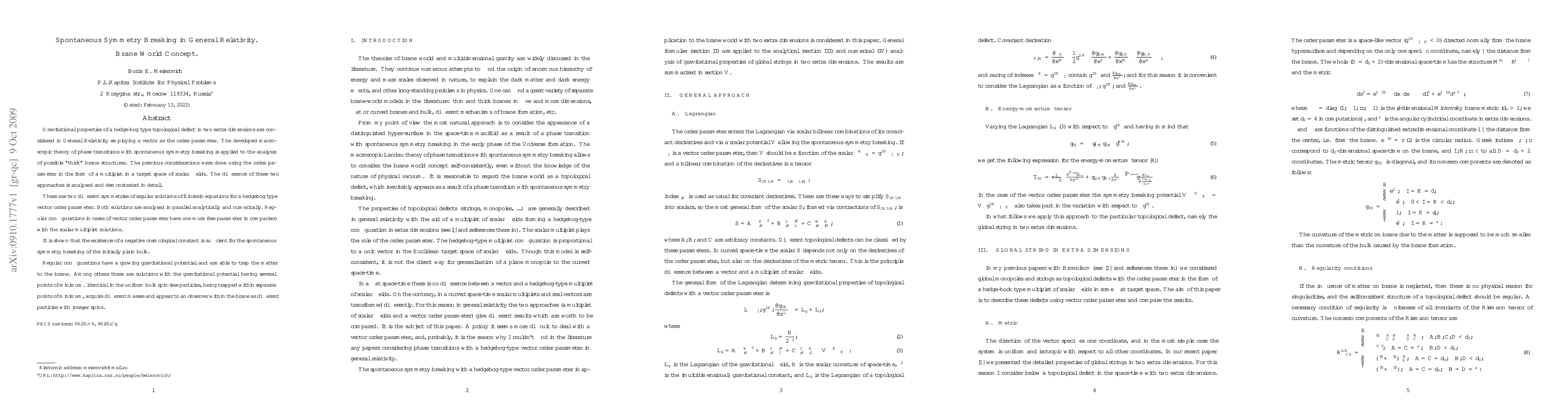 Gravitational properties of a hedge-hog type topological defect in two extra dimensions are considered in General Relativity employing a vector as the order parameter. The developed macroscopic theory of phase transitions with spontaneous symmetry breaking is applied to the analysis of possible "thick" brane structures. The previous considerations were done using the order parameter in the form of a multiplet in a target space of scalar fields. The difference of these two approaches is analyzed and demonstrated in detail. There are two different symmetries of regular solutions of Einstein equations for a hedgehog type vector order parameter. Both solutions are analyzed in parallel analytically and numerically. Regular configurations in cases of vector order parameter have one more free parameter in comparison with the scalar multiplet solutions. It is shown that the existence of a negative cosmological constant is sufficient for the spontaneous symmetry breaking of the initially plain bulk. Regular configurations have a growing gravitational potential and are able to trap the matter to the brane. Among others there are solutions with the gravitational potential having several points of minimum. Identical in the uniform bulk spin-less particles, being trapped within separate points of minimum, acquire different masses and appear to an observer within the brane as different particles with integer spins.