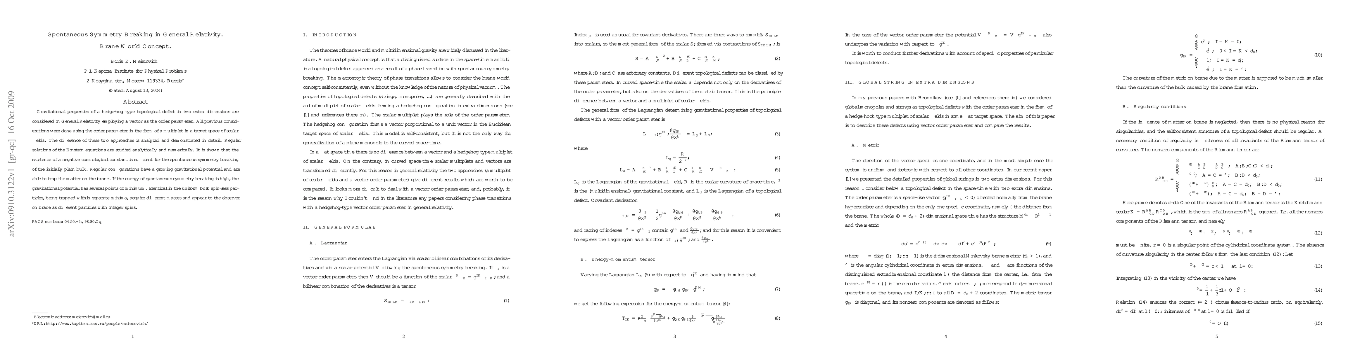 This paper investigates gravitational properties of topological defects in General Relativity using a vector order parameter, contrasting it with scalar field approaches. It demonstrates that a negative cosmological constant induces spontaneous symmetry breaking, leading to distinct particle masses and spins observed on a brane.