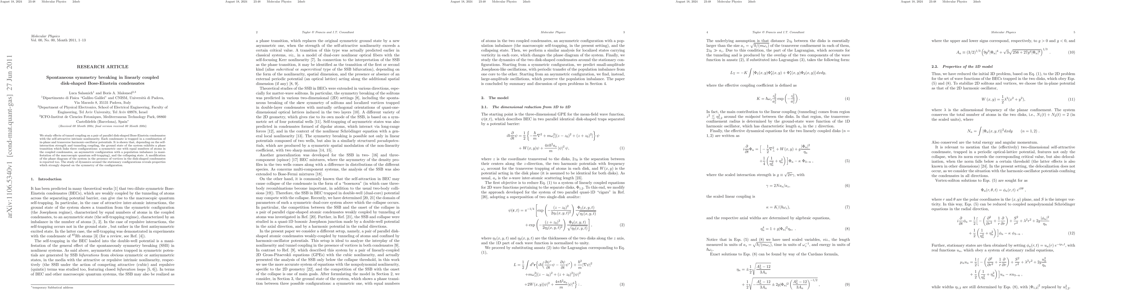 This paper investigates the effects of tunnel coupling on two parallel disk-shaped Bose-Einstein condensates with self-attraction, revealing a phase transition linking symmetric, asymmetric, and collapsing states based on self-interaction and coupling strength. The study also reports modifications to the phase diagram in the presence of vortices and examines dynamic properties around stationary configurations.
