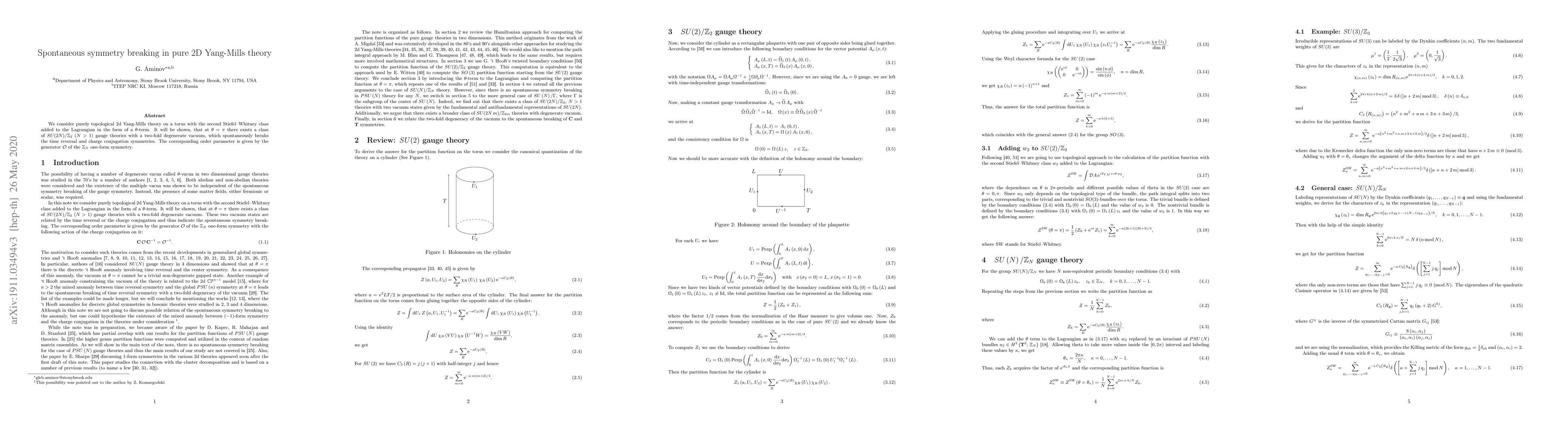 We consider purely topological $2$d Yang-Mills theory on a torus with the second Stiefel-Whitney class added to the Lagrangian in the form of a $\theta$-term. It will be shown, that at $\theta=\pi$ there exists a class of $SU(2 N)/\mathbb{Z}_2$ ($N>1$) gauge theories with a two-fold degenerate vacuum, which spontaneously breaks the time reversal and charge conjugation symmetries. The corresponding order parameter is given by the generator $\mathcal{O}$ of the $\mathbb{Z}_N$ one-form symmetry.