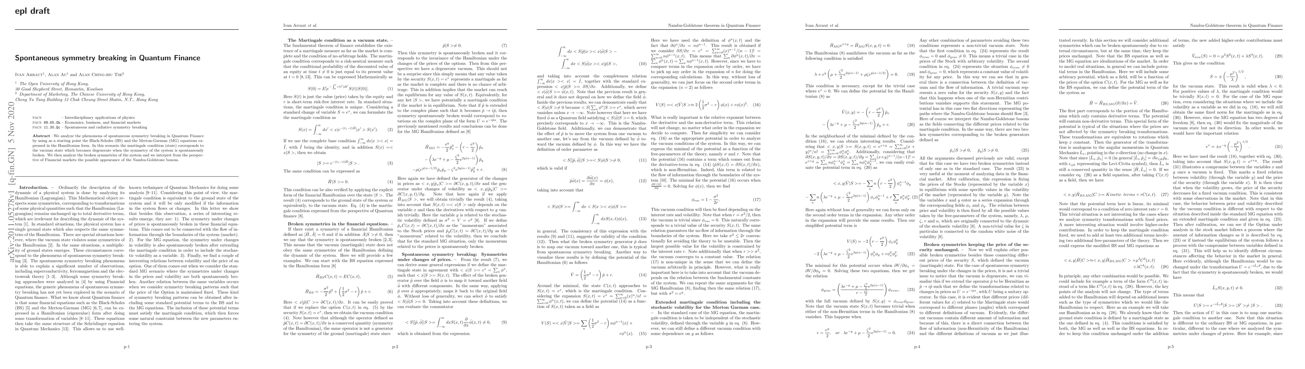 Researchers analyzed spontaneous symmetry breaking in Quantum Finance using Black-Scholes and Merton-Garman equations, revealing the emergence of Nambu-Goldstone bosons that can be interpreted as a possible explanation for market phenomena.