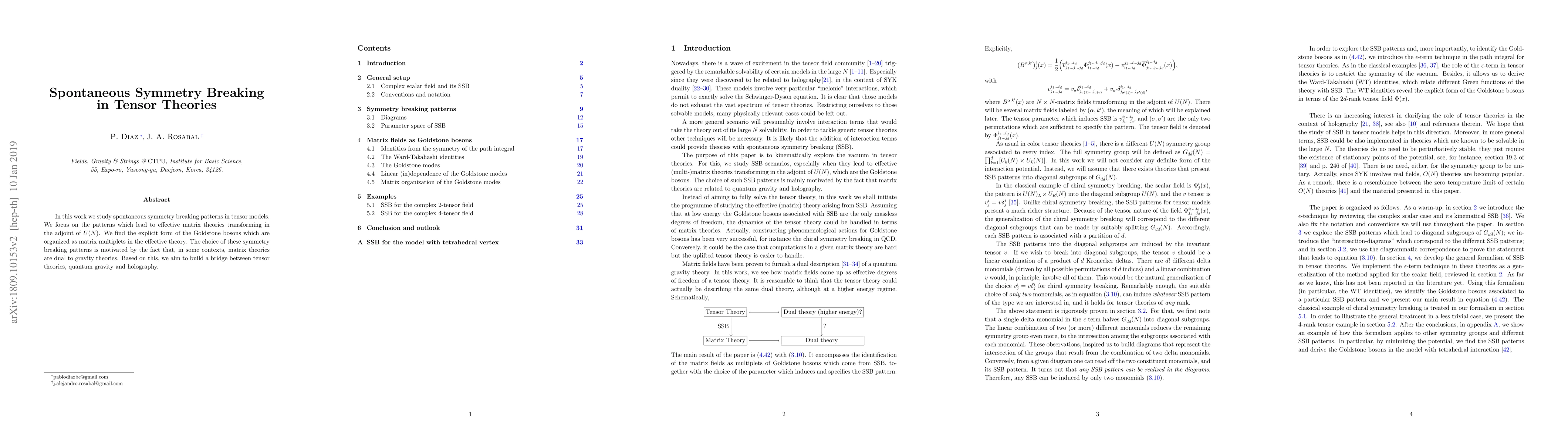 This paper investigates spontaneous symmetry breaking in tensor models, identifying patterns that yield effective matrix theories in the adjoint representation of $U(N)$. It explicitly determines the Goldstone bosons organized as matrix multiplets, aiming to connect tensor theories with quantum gravity and holography.