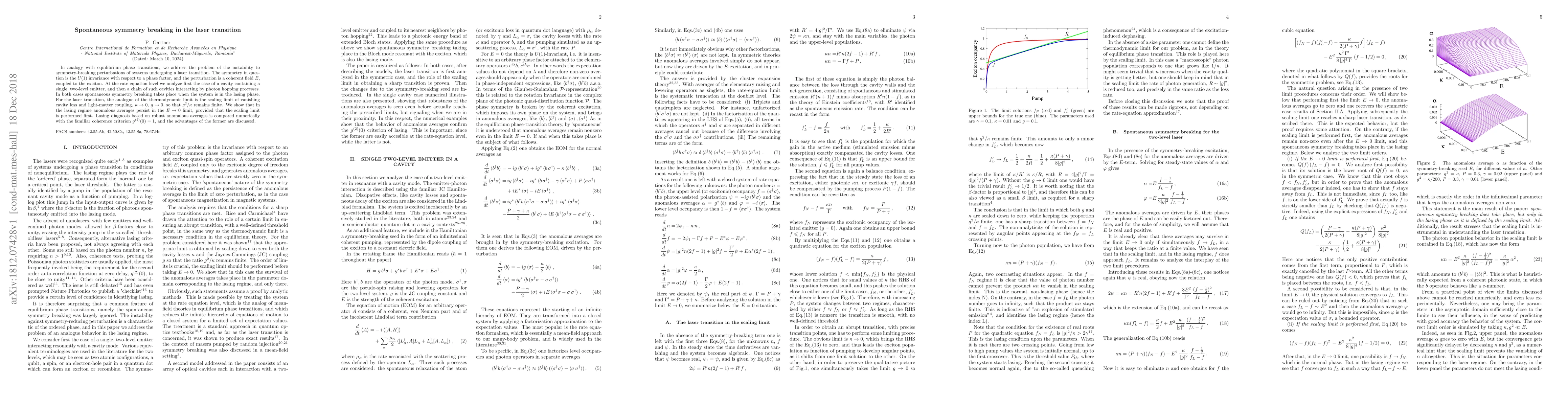In analogy with equilibrium phase transitions, we address the problem of the instability to symmetry-breaking perturbations of systems undergoing a laser transition. The symmetry in question is the $U(1)$ invariance with respect to a phase factor, and the perturbation is a coherent field $E$, coupled to the exciton. At the rate equation level we analyze first the case of a cavity containing a single, two-level emitter, and then a chain of such cavities interacting by photon hopping processes. In both cases spontaneous symmetry breaking takes place when the system is in the lasing phase. For the laser transition, the analogue of the thermodynamic limit is the scaling limit of vanishing cavity loss and light-matter coupling, $\kappa \to 0$, $g \to 0$, so that $g^2/\kappa$ remains finite. We show that in the lasing regime anomalous averages persist in the $E \to 0$ limit, provided that the scaling limit is performed first. Lasing diagnosis based on robust anomalous averages is compared numerically with the familiar coherence criterion $g^{(2)}(0)=1$, and the advantages of the former are discussed.