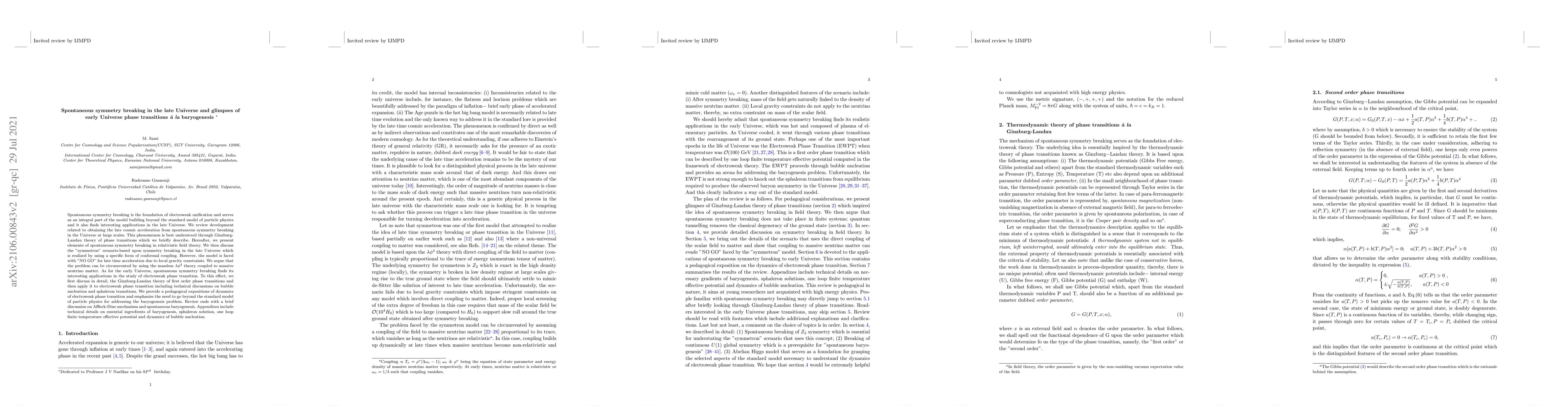 This paper reviews spontaneous symmetry breaking's role in both late and early Universe physics, focusing on its implications for cosmic acceleration and baryogenesis. It discusses the "symmetron" scenario for late-time acceleration and proposes a solution using massless $\lambda \phi^4$ theory, while also detailing the electroweak phase transition and its connection to baryogenesis.