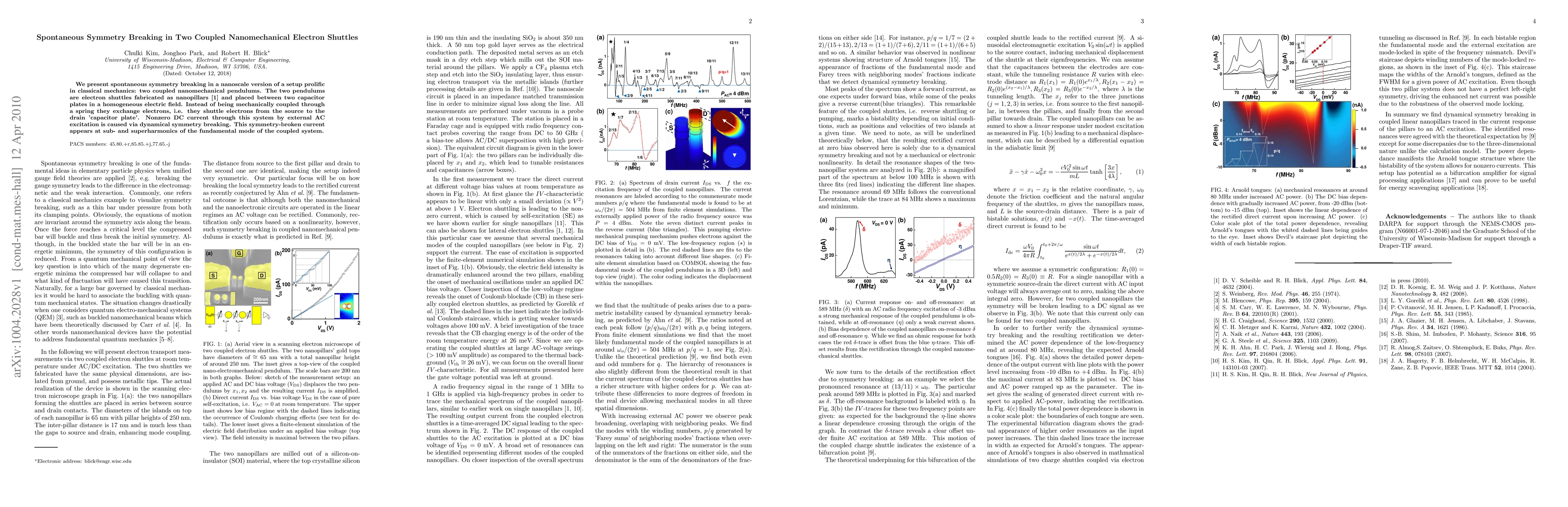 We present spontaneous symmetry breaking in a nanoscale version of a setup prolific in classical mechanics: two coupled nanomechanical pendulums. The two pendulums are electron shuttles fabricated as nanopillars and placed between two capacitor plates in a homogeneous electric field. Instead of being mechanically coupled through a spring they exchange electrons, i.e. they shuttle electrons from the source to the drain 'capacitor plate'. Nonzero DC current through this system by external AC excitation is caused via dynamical symmetry breaking. This symmetry-broken current appears at sub- and superharmonics of the fundamental mode of the coupled system.