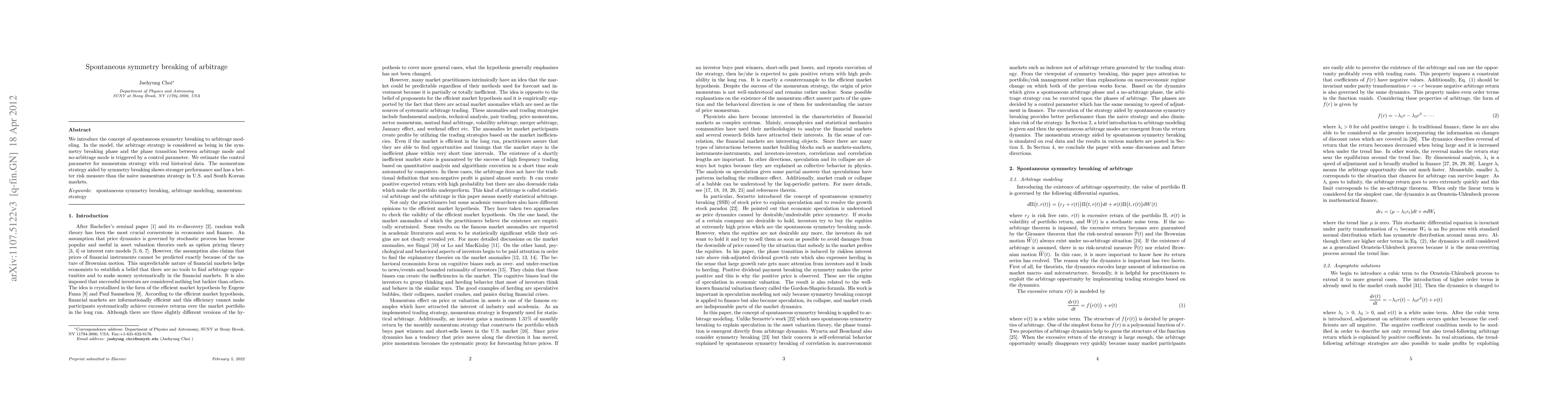 This paper applies the concept of spontaneous symmetry breaking to arbitrage modeling, demonstrating that a momentum strategy benefits from this approach, showing improved performance and risk measures compared to traditional methods in U.S. and South Korean markets.
