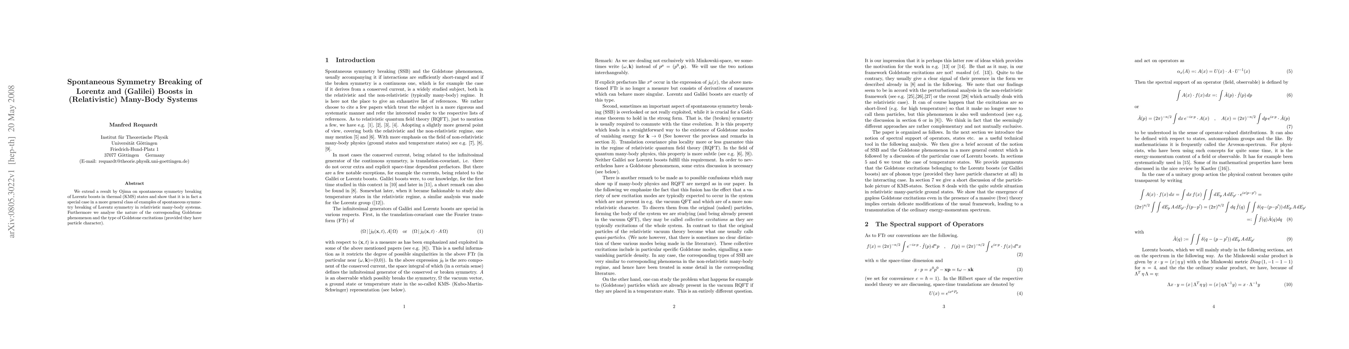 This paper extends Ojima's findings on spontaneous symmetry breaking of Lorentz boosts in thermal states to relativistic many-body systems, identifying it as a subset of a broader phenomenon. It also examines the associated Goldstone phenomenon and the characteristics of potential Goldstone excitations.