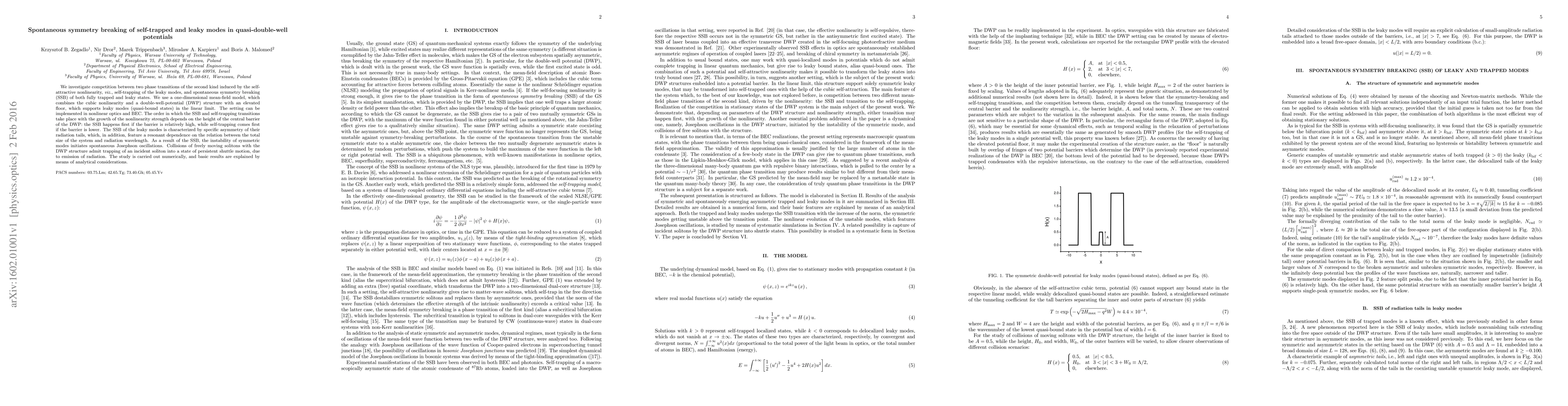 We investigate competition between two phase transitions of the second kind induced by the self-attractive nonlinearity, viz., self-trapping of the leaky modes, and spontaneous symmetry breaking (SSB) of both fully trapped and leaky states. We use a one-dimensional mean-field model, which combines the cubic nonlinearity and a double-well-potential (DWP) structure with an elevated floor, which supports leaky modes (quasi-bound states) in the linear limit. The setting can be implemented in nonlinear optics and BEC. The order in which the SSB and self-trapping transitions take place with the growth of the nonlinearity strength depends on the height of the central barrier of the DWP: the SSB happens first if the barrier is relatively high, while self-trapping comes first if the barrier is lower. The SSB of the leaky modes is characterized by specific asymmetry of their radiation tails, which, in addition, feature a resonant dependence on the relation between the total size of the system and radiation wavelength. As a result of the SSB, the instability of symmetric modes initiates spontaneous Josephson oscillations. Collisions of freely moving solitons with the DWP structure admit trapping of an incident soliton into a state of persistent shuttle motion, due to emission of radiation. The study is carried out numerically, and basic results are explained by means of analytical considerations.