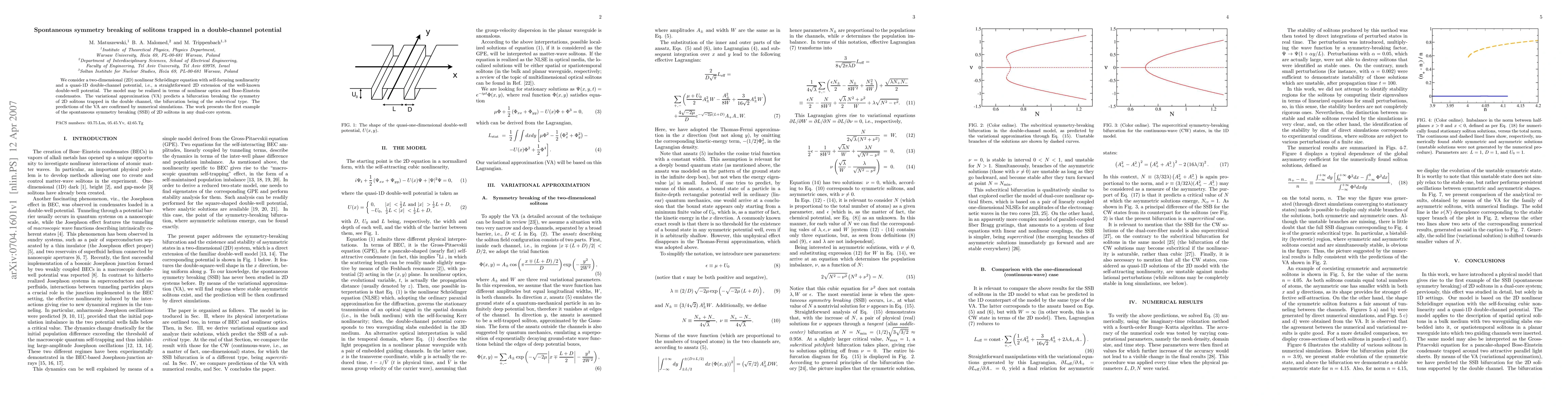 This paper investigates a 2D nonlinear Schrödinger equation with self-focusing nonlinearity and a double-channel potential, demonstrating spontaneous symmetry breaking of solitons via variational approximation and numerical simulations. This marks the first instance of such symmetry breaking in dual-core systems, applicable to nonlinear optics and Bose-Einstein condensates.