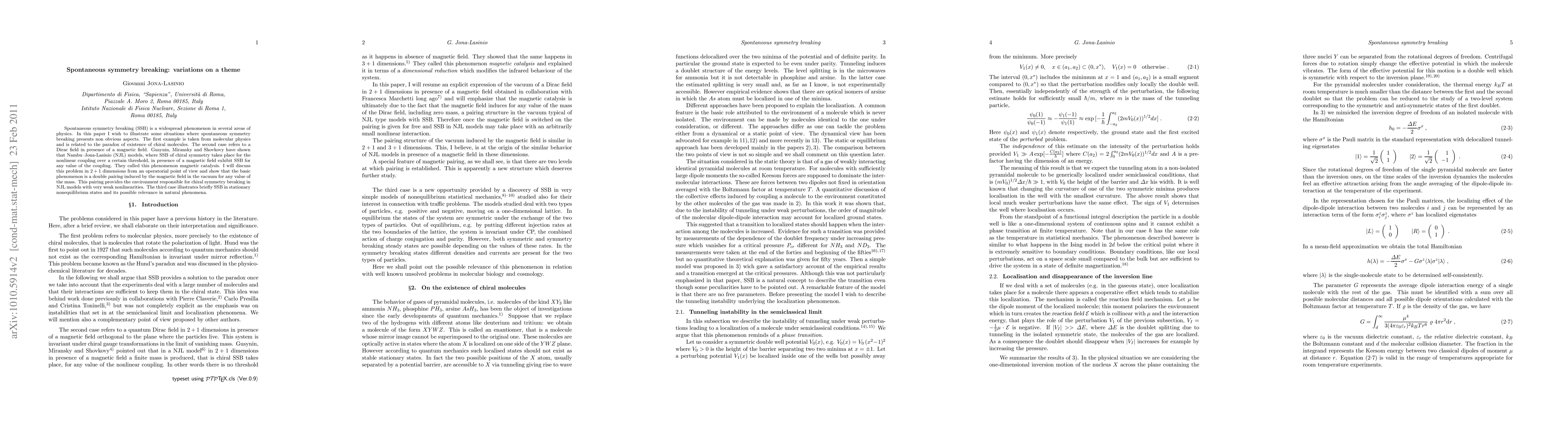 Spontaneous symmetry breaking (SSB) is a widespread phenomenon in several areas of physics. In this paper I wish to illustrate some situations where spontaneous symmetry breaking presents non obvious aspects. The first example is taken from molecular physics and is related to the paradox of existence of chiral molecules. The second case refers to a Dirac field in presence of a magnetic field. Gusynin, Miransky and Shovkovy have shown that Nambu-Jona-Lasinio (NJL) models, where SSB of chiral symmetry takes place for the nonlinear coupling over a certain threshold, in presence of a magnetic field exhibit SSB for any value of the coupling. They called this phenomenon magnetic catalysis. I will discuss this problem in 2 + 1 dimensions from an operatorial point of view and show that the basic phenomenon is a double pairing induced by the magnetic field in the vacuum for any value of the mass. This pairing provides the environment responsible for chiral symmetry breaking in NJL models with very weak nonlinearities. The third case illustrates briefly SSB in stationary nonequilibrium states and its possible relevance in natural phenomena.
