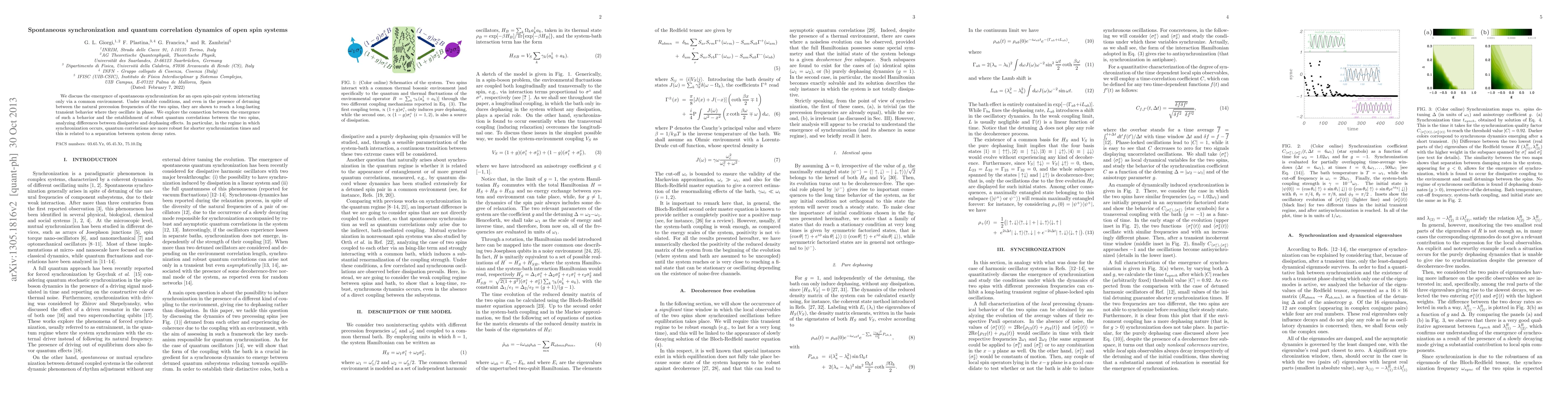 This paper explores spontaneous synchronization in open spin-pair systems interacting through a shared environment, demonstrating that despite detuning, the spins can exhibit long-lasting phase oscillations. The study also investigates the relationship between this synchronization and the development of robust quantum correlations, distinguishing between dissipative and dephasing effects.