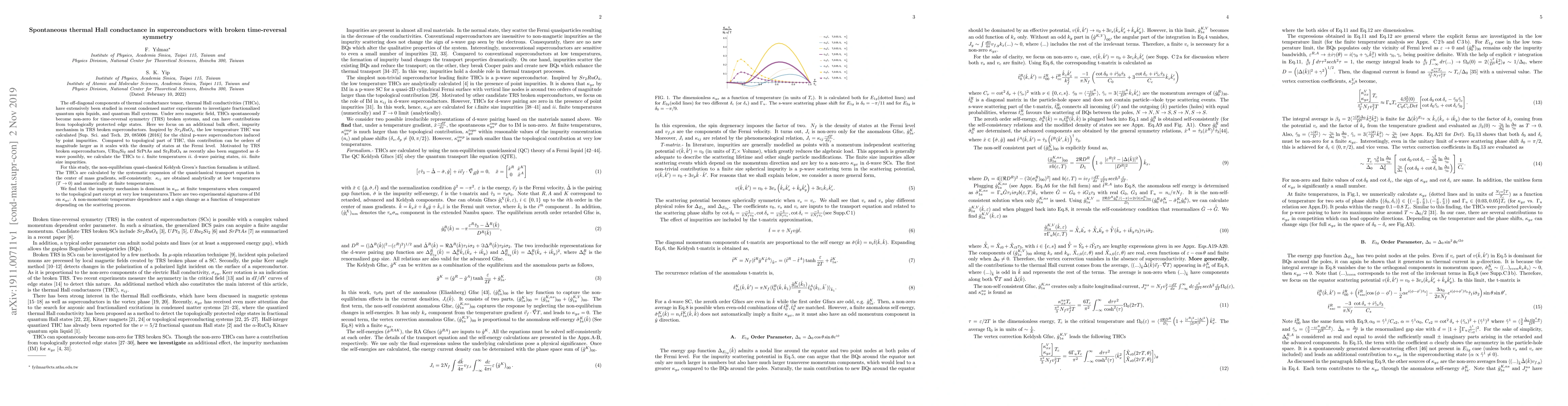 The off-diagonal components of thermal conductance tensor, thermal Hall conductivities (THCs), have extensively been studied in recent condensed matter experiments to investigate fractionalized quantum spin liquids, and quantum Hall systems. Under zero magnetic field, THCs spontaneously become non-zero for time-reversal symmetry (TRS) broken systems, and can have contributions from topologically protected edge states. Here we focus on an additional bulk effect, the impurity mechanism in TRS broken superconductors. Inspired by $Sr_2 Ru O_4$, the low temperature THC was calculated [Sup. Sci. and Tech. 29, 085006 (2016)] for the chiral p-wave superconductors induced by point impurities. Compared to topological part of THC, this contribution can be orders of magnitude larger as it scales with the density of states at the Fermi level. Motivated by TRS broken superconductors, URu$_2$Si$_2$ and SrPtAs and Sr$_2$RuO$_4$ as recently also been suggested as d-wave possibly, we calculate the THCs to $i.$ finite temperatures $ii.$ d-wave pairing states, $iii.$ finite size impurities. For this study, the non-equilibrium quasi-classical Keldysh Green's function formalism is utilized. The THCs are calculated by the systematic expansion of the quasiclassical transport equation in the center of mass gradients, self-consistently. $\kappa_{ij}$ are obtained analytically at low temperatures ($T \to 0$) and numerically at finite temperatures. We find that the impurity mechanism is dominant in $\kappa_{yx}$ at finite temperatures when compared to the topological part except at very low temperatures.There are two experimental signatures of IM on $\kappa_{yx}$: A non-monotonic temperature dependence and a sign change as a function of temperature depending on the scattering process.