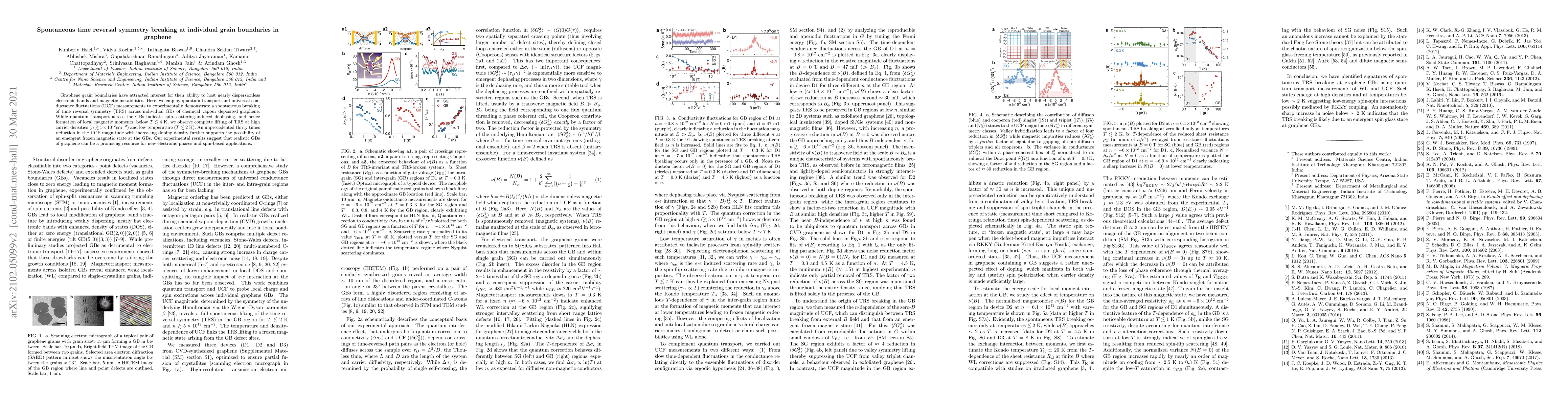 Graphene grain boundaries have attracted interest for their ability to host nearly dispersionless electronic bands and magnetic instabilities. Here, we employ quantum transport and universal conductance fluctuations (UCF) measurements to experimentally demonstrate a spontaneous breaking of time reversal symmetry (TRS) across individual GBs of chemical vapour deposited graphene. While quantum transport across the GBs indicate spin-scattering-induced dephasing, and hence formation of local magnetic moments, below $T\lesssim 4$ K, we observe complete lifting of TRS at high carrier densities ($n \gtrsim 5\times 10^{12}$cm$^{-2}$) and low temperature ($T\lesssim 2$ K). An unprecedented thirty times reduction in the UCF magnitude with increasing doping density further supports the possibility of an emergent frozen magnetic state at the GBs. Our experimental results suggest that realistic GBs of graphene can be a promising resource for new electronic phases and spin-based applications.