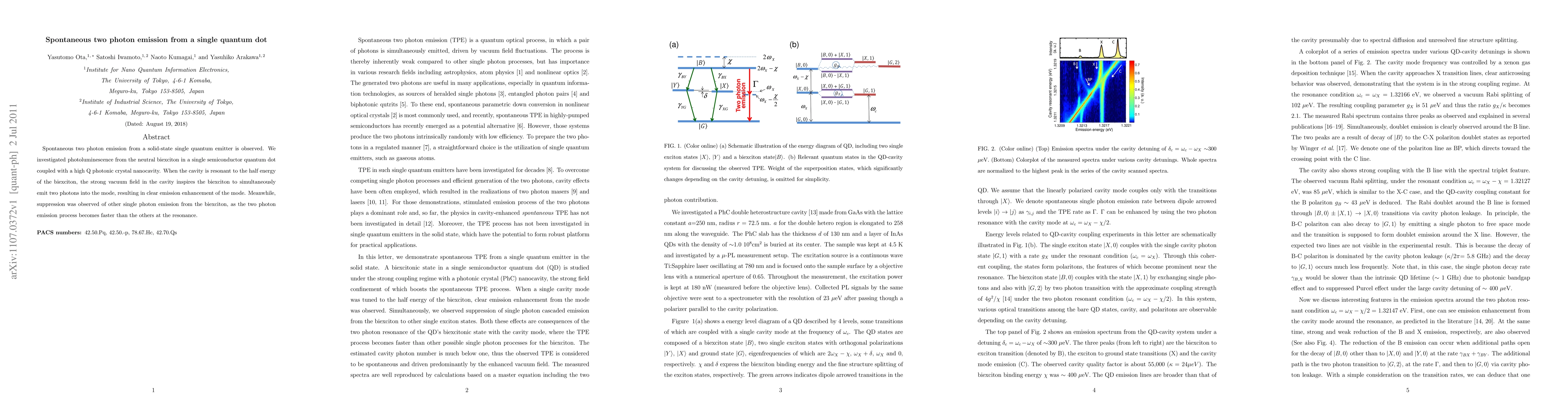 This paper reports the observation of spontaneous two photon emission from a single quantum dot in a high Q photonic crystal nanocavity, demonstrating enhanced emission when the cavity resonates with half the biexciton energy, while suppressing single photon emission.